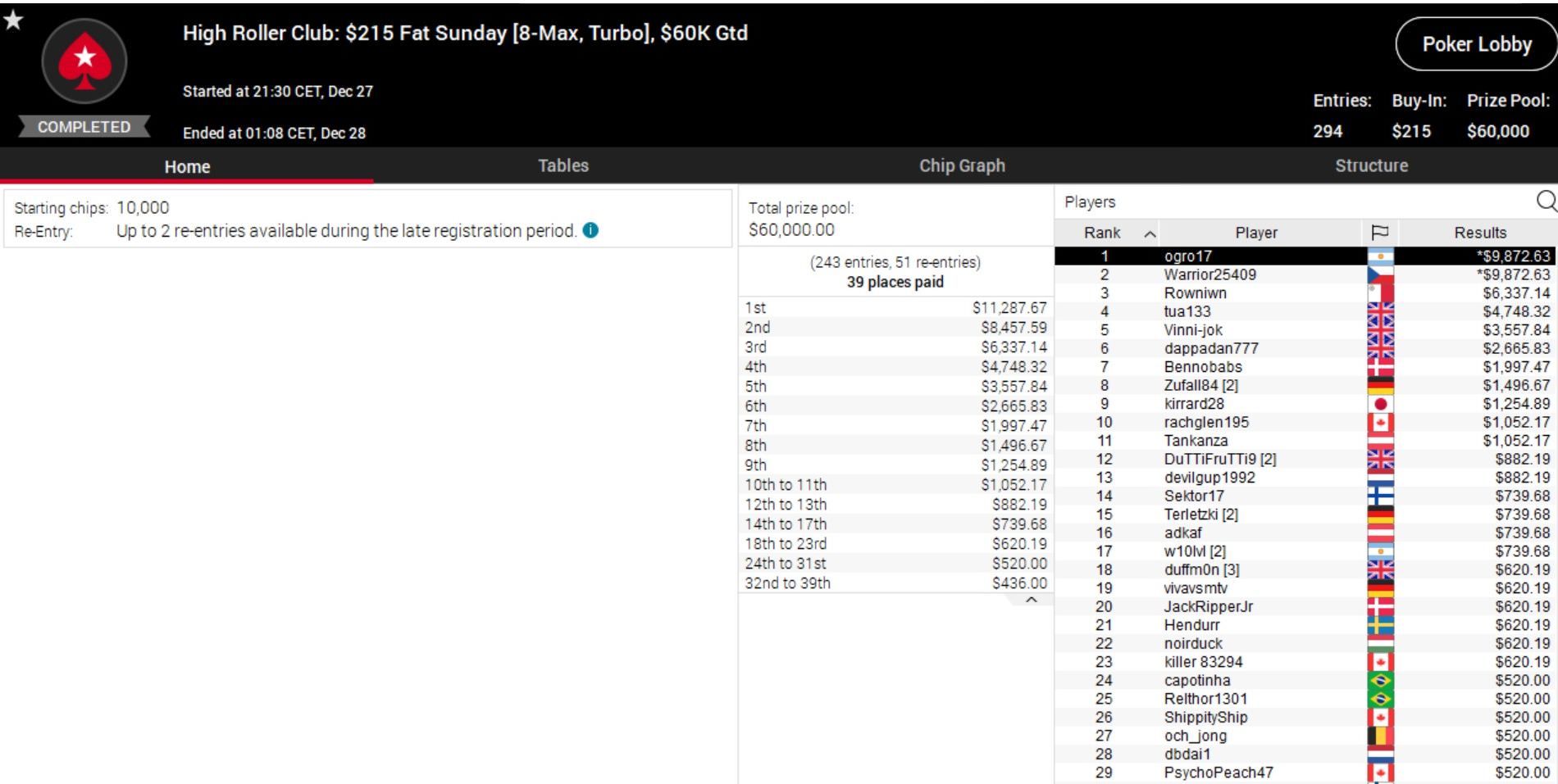Im High Roller Club auf PokerStars standen am Sonntag die üblichen Turniere auf dem Programm, außerdem wurde die Blowout Series gestartet.