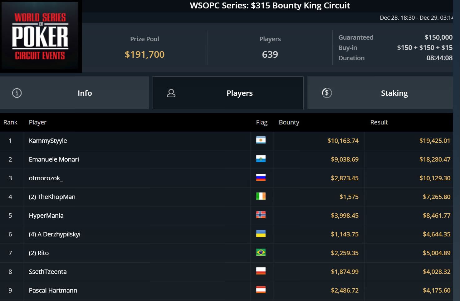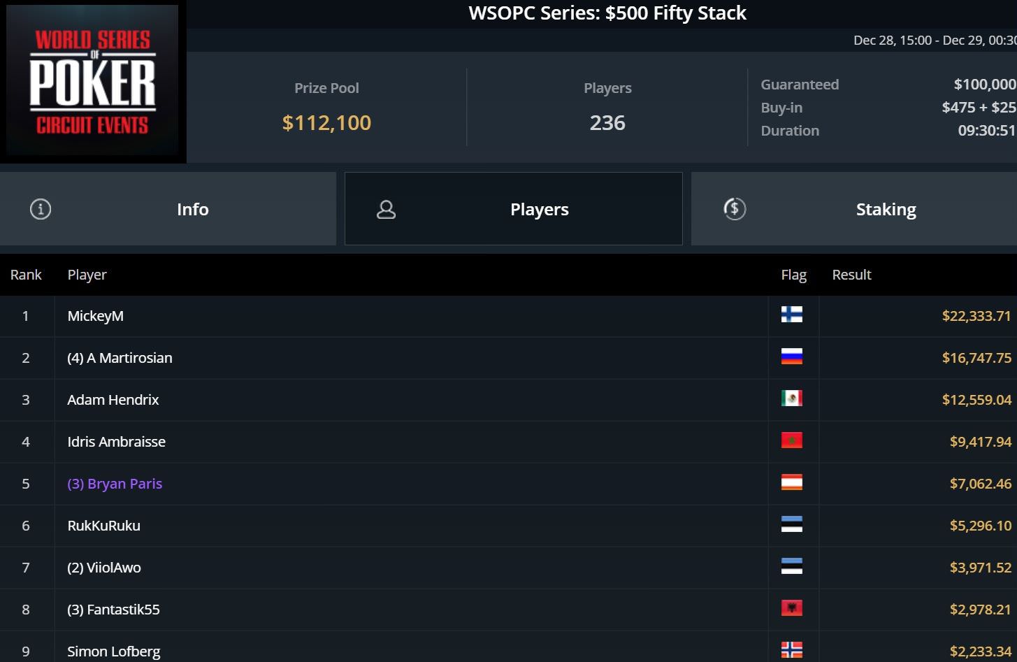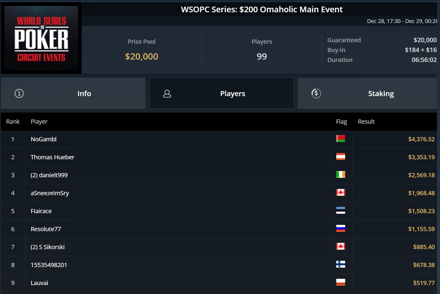 Mit einem neunten Platz beim $315 Bounty King Circuit baute Hartmann seine Gewinne um weitere $4.000 aus, während Thomas Hueber beim $200 Omaholic Main Event den zweiten Platz belegte. Der PLO-Spezialist durfte sich über gut $3.300 freuen.