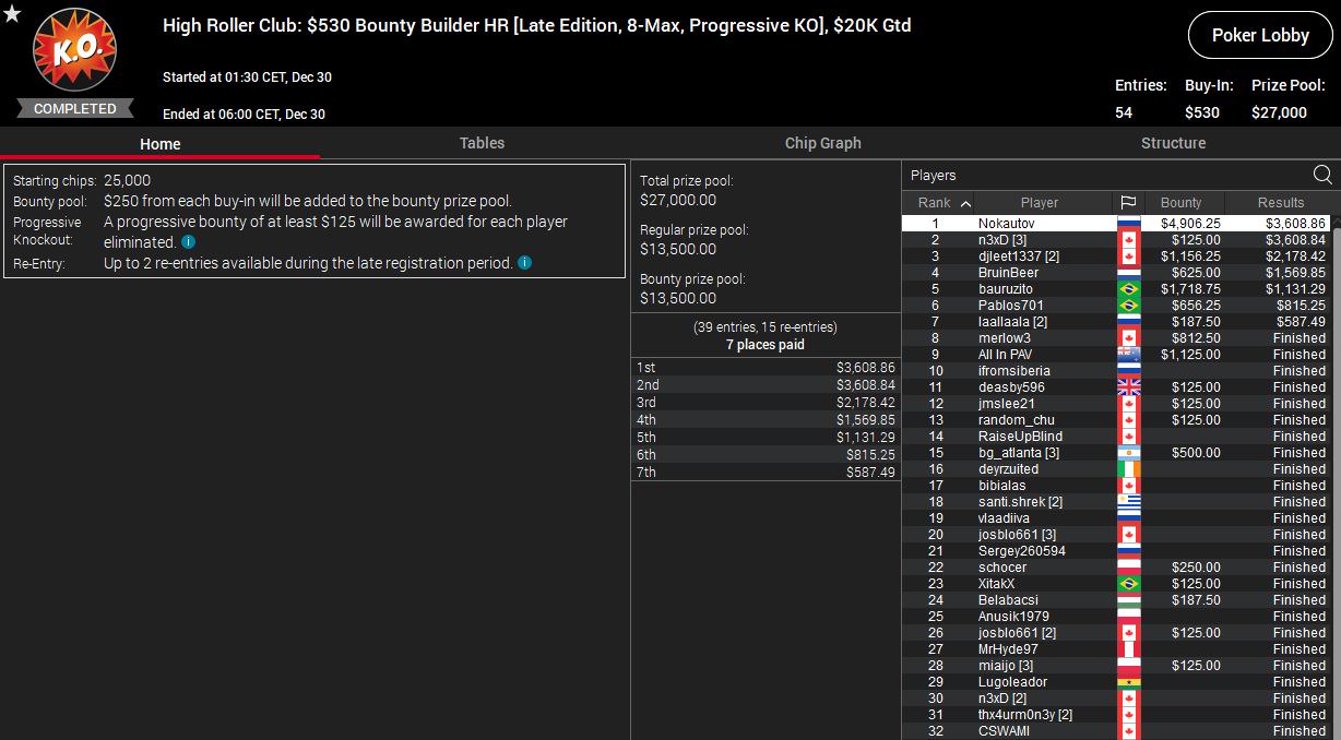 Beim $530 Bounty Builder HR waren die Farben Österreichs ebenfalls am Final Table zu sehen, allerdings handelt es sich bei adkaf ($7.128,85/$6.261,72), der Platz drei belegte, um den Slowaken Marian Friedrich. Den Turniersieg feierte der Lette poker@luffyD ($10.803,35/$10.035,13).