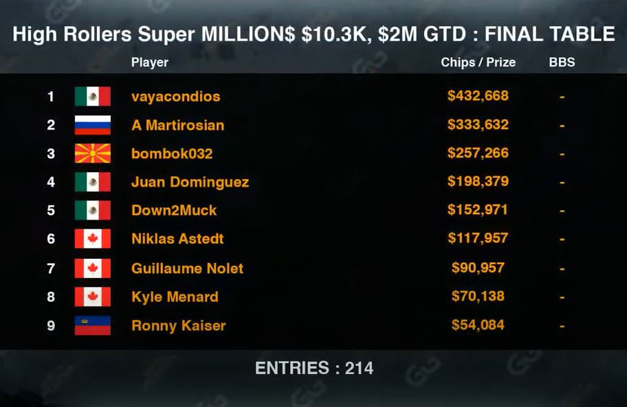 Bei der jüngsten Ausgabe des Super MILLION$ auf GGPoker wurden am Dienstagabend wieder enorm hohe Preisgelder ausgespielt. Insgesamt hatte es diesmal 214 Anmeldungen für das $10.300-Turnier gegeben, sodass die garantierten $2 Million um $140.000 überboten wurden.