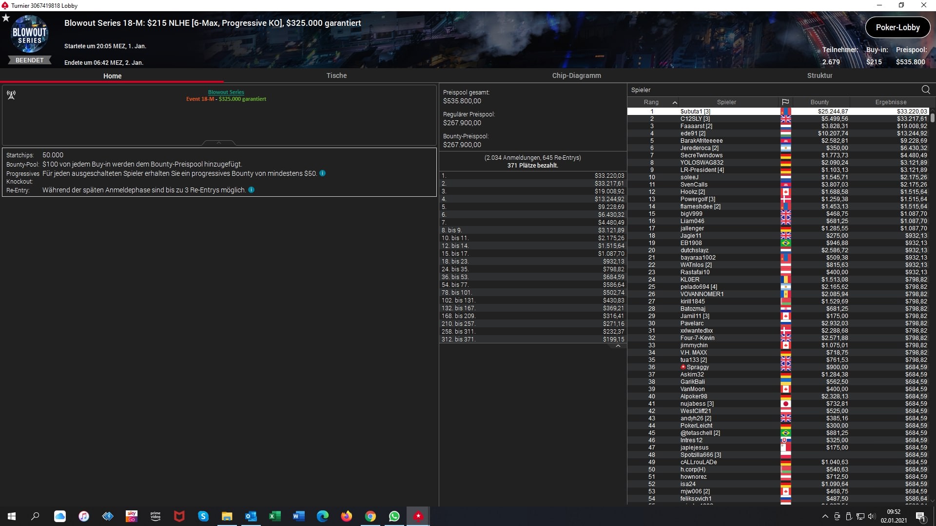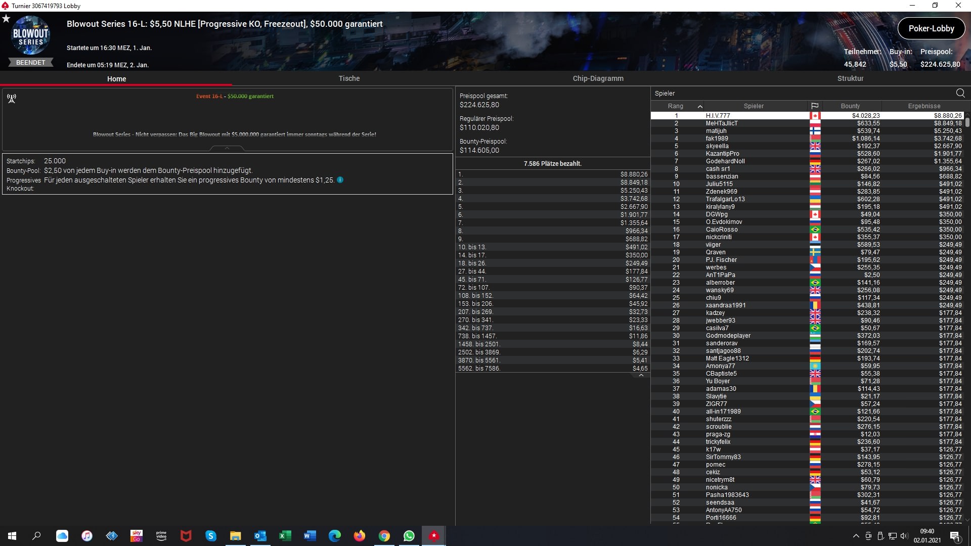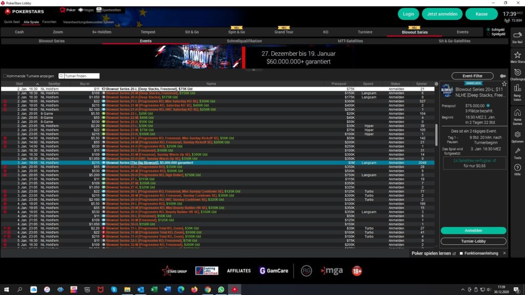 Am Neujahrstag wurde bei der Blowout Series auf Pokerstars der Tag 5 gespielt. Hier standen insgesamt 12 Turniere auf dem Programm, bei denen unglaubliche 328.490 Entries und $5.246.788 an Preisgeldern zusammen kamen.