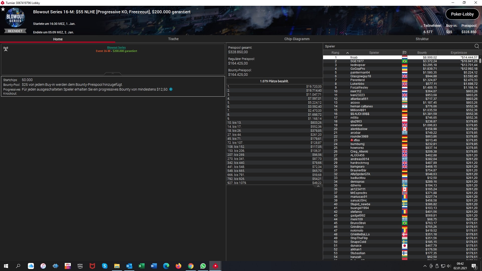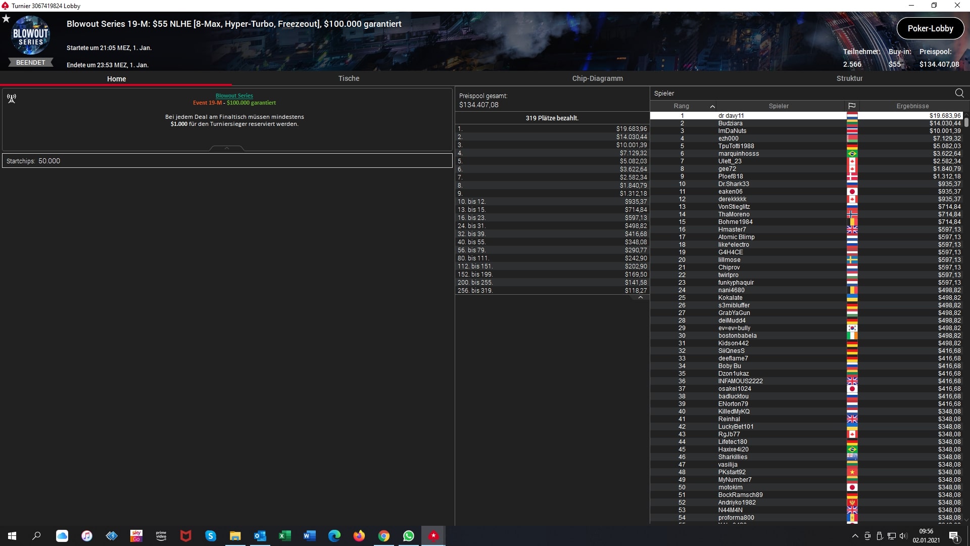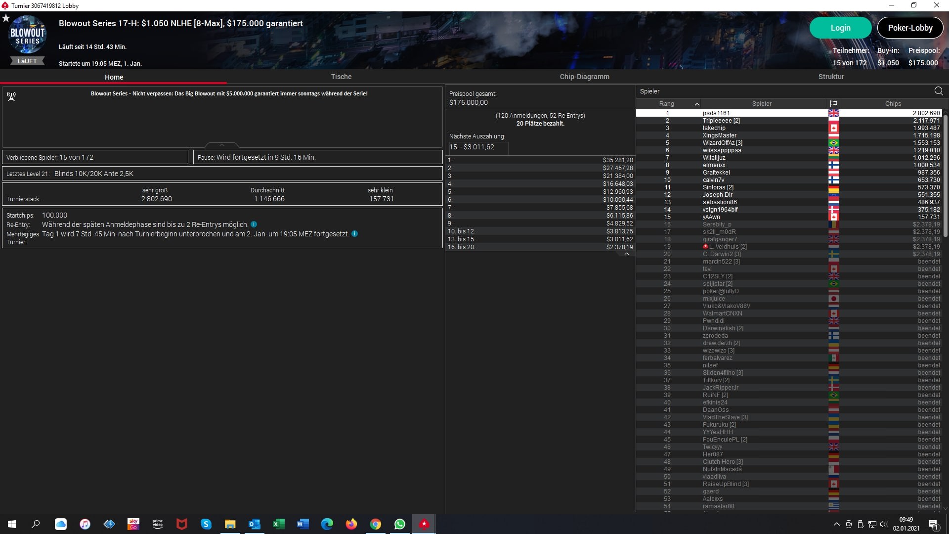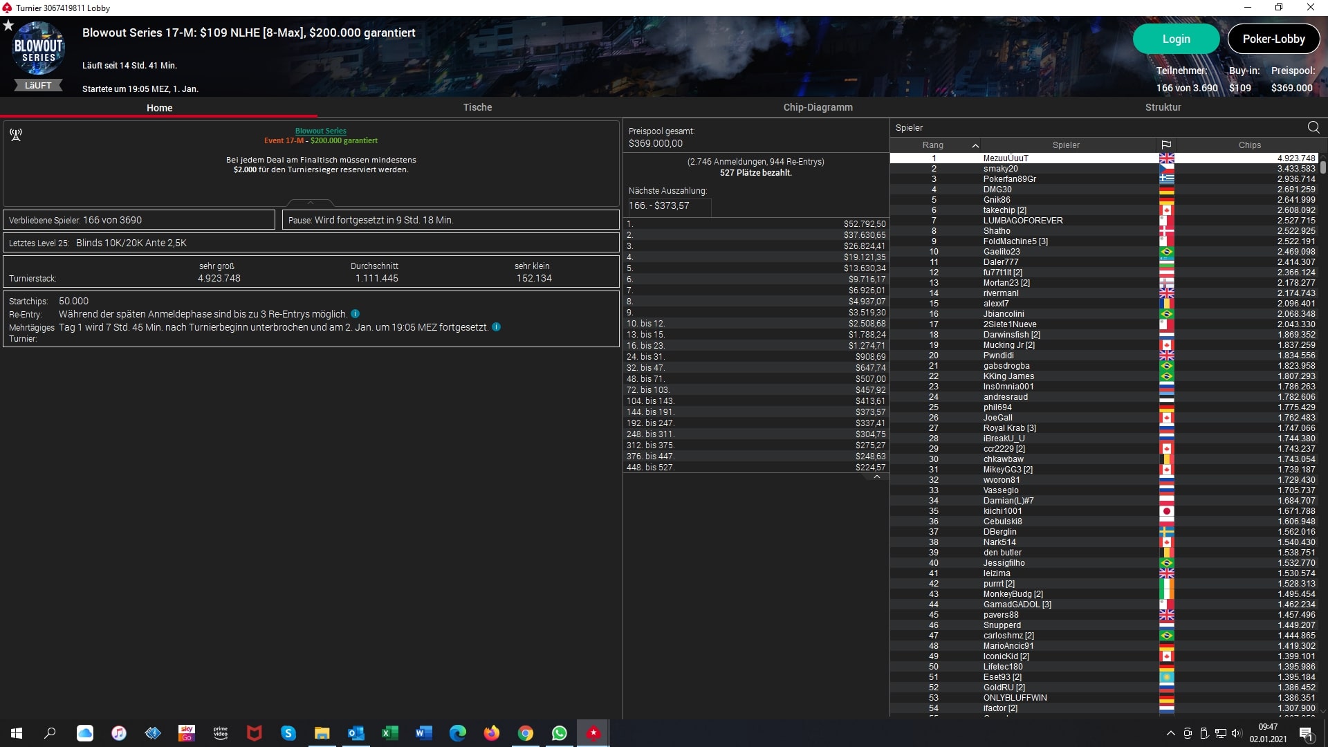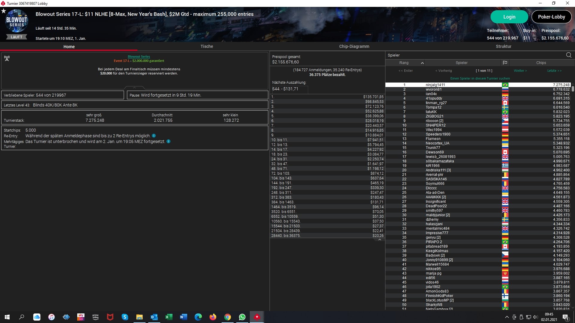 Zum Start ins neue Jahr verschenkte PokerStars an viele Kunden Turnier Tickets für die Blowout Series. Darunter auch ein $11 Ticket für den „New Years Bash“ #17-L. Hier hatte man sich mit einem Buy-In von $11 und garantierten $2.000.000 ein hohes Ziel gesetzt. Am Ende kamen sogar unglaubliche 219.967 Entries zusammen und der Preispool wuchs auf $2.155.676 an. Allein für den Champion sind $135.701 reserviert. Am Ende von Tag 1 waren noch 544 Spieler im Rennen, die alle schon ein Preisgeld von $131 sicher haben. Am Samstagabend geht es um 19:05 mit dem Finale weiter. Den Chiplead hält der Brasilianer „ninjaly“. bester DACH-Spieler ist aktuell „ian04x“ (GER) auf Rang 3.