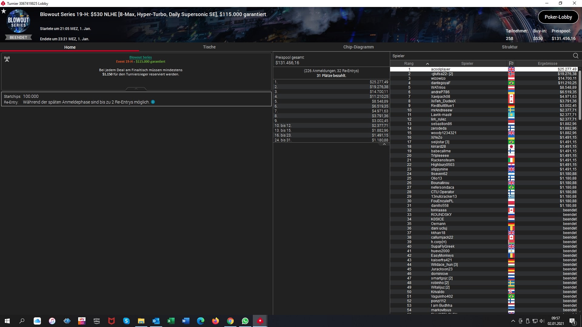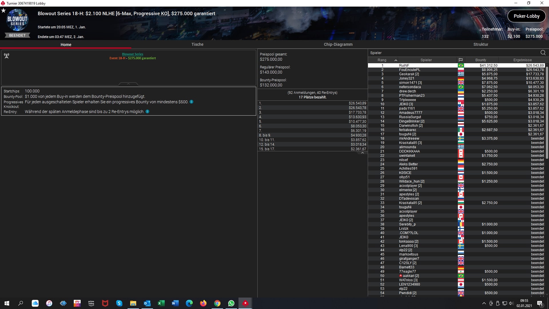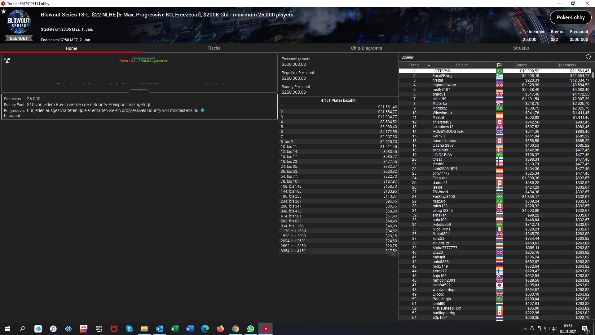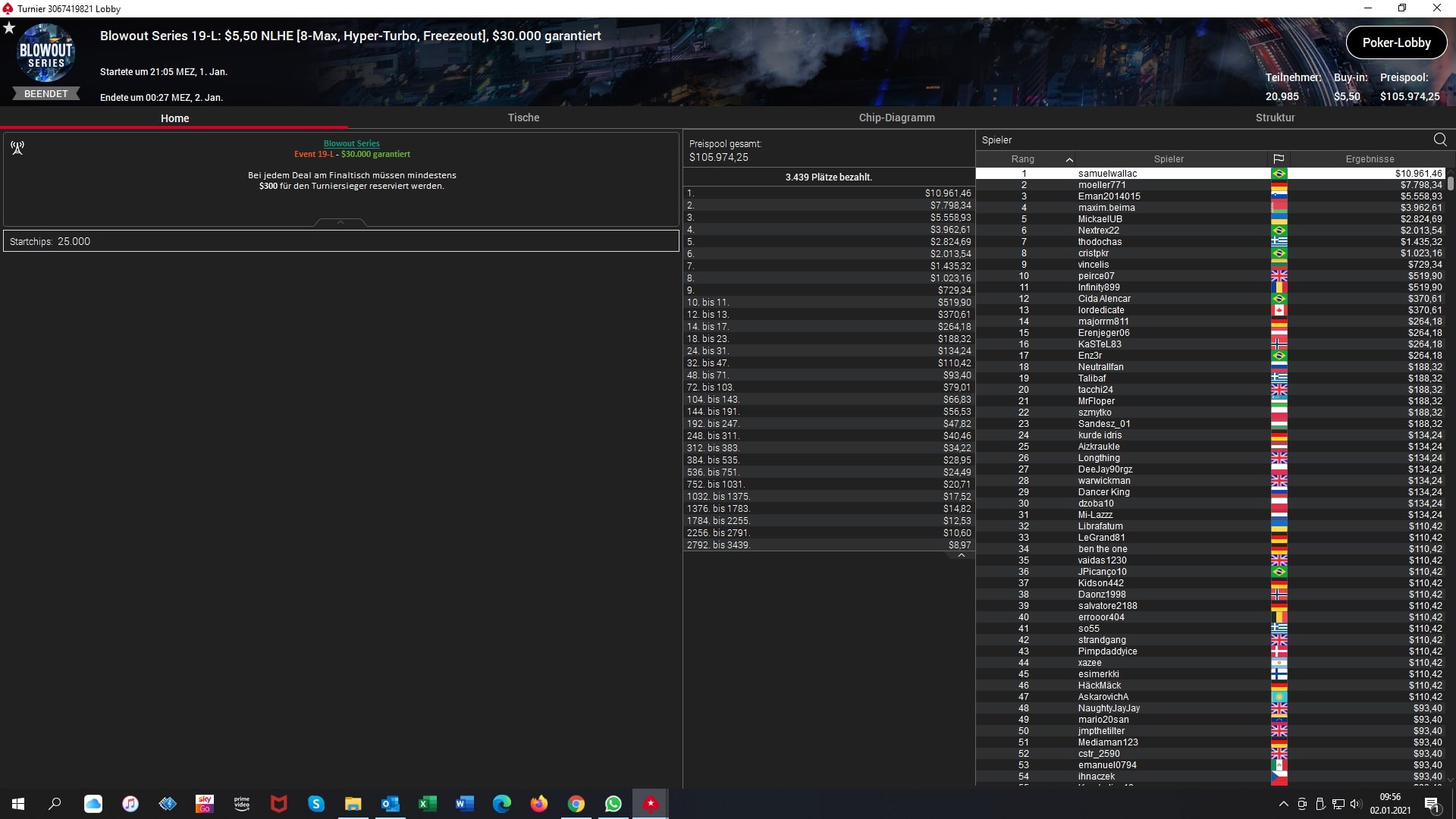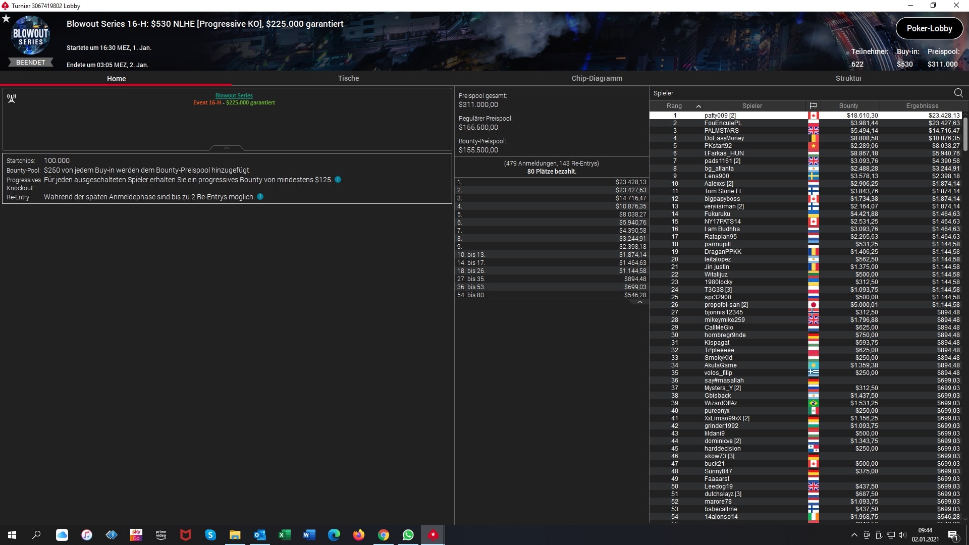 Zum Start ins neue Jahr verschenkte PokerStars an viele Kunden Turnier Tickets für die Blowout Series. Darunter auch ein $11 Ticket für den „New Years Bash“ #17-L. Hier hatte man sich mit einem Buy-In von $11 und garantierten $2.000.000 ein hohes Ziel gesetzt. Am Ende kamen sogar unglaubliche 219.967 Entries zusammen und der Preispool wuchs auf $2.155.676 an. Allein für den Champion sind $135.701 reserviert. Am Ende von Tag 1 waren noch 544 Spieler im Rennen, die alle schon ein Preisgeld von $131 sicher haben. Am Samstagabend geht es um 19:05 mit dem Finale weiter. Den Chiplead hält der Brasilianer „ninjaly“. bester DACH-Spieler ist aktuell „ian04x“ (GER) auf Rang 3.