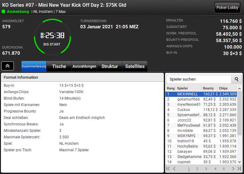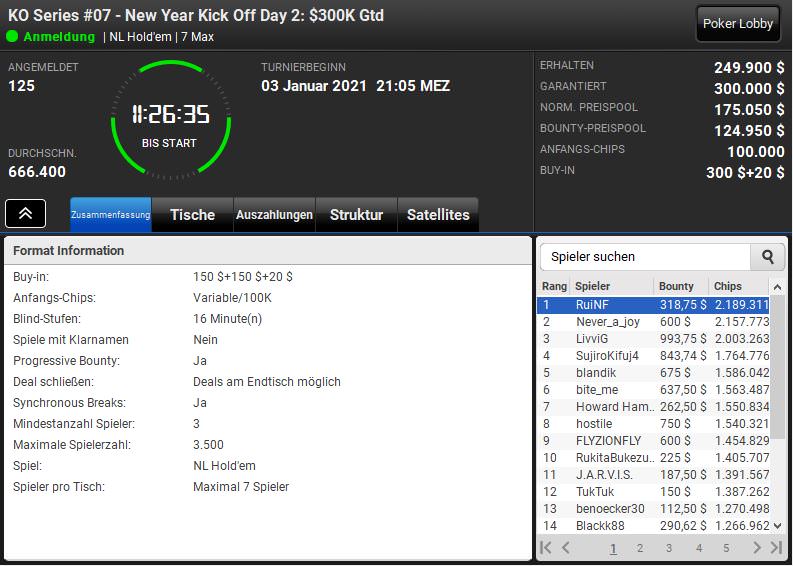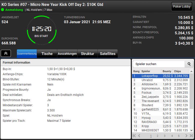 Die zweiten Starttage beim New Year Kick Off (Event #07) waren erneut sehr gut besucht. Obwohl noch ein weiterer Starttag (1C) aussteht, sind die garantierten $75.000 der $33 Mini-Ausgabe ($116.760) und die garantierten $10.000 Buy-in der $3,30 Micro-Ausgabe ($10.545) bereits geknackt. Beim großen $320 New Year Kick Off fehlen bei $300.000 GTD nur noch $51.100. Starttag 1C beginnt heute um 17:05 Uhr, Spieltag 2 dann im Anschluss um 21:05 Uhr.