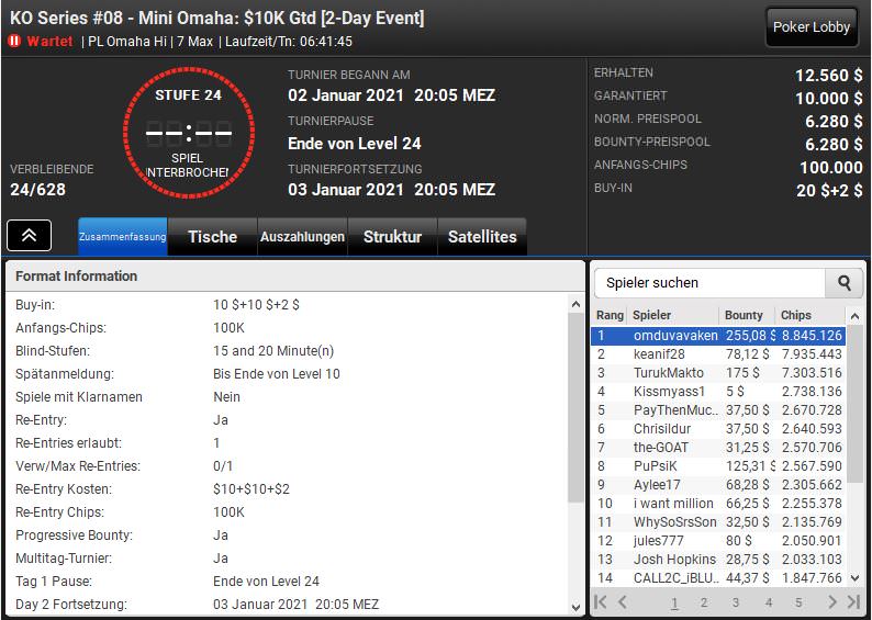 Außerdem werden heute Abend die Turniere von Event #08 entschieden. Für das $215 Big Omaha PKO meldeten gestern 156 Spieler, die letzten zehn spielen ab 20:05 Uhr den Großteil der insgesamt $31.200 aus. Beim $22 Mini Omaha PKO ($12.560) sind noch 24 Spieler im Rennen, beim $2,20 Micro Omaha ($2.000) noch 22 Spieler.