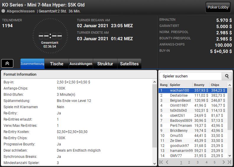 Bei den Side Events avancierte BARno7 zum großen Abräumer. Er gewann das $109 NLHE 8-Max PKO und sicherte sich neben $4.593,66 Prämie zusätzlich $6.847,74 an Bounties.