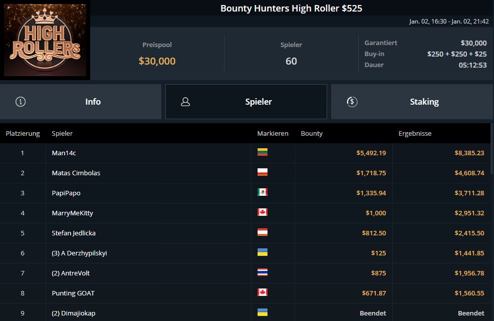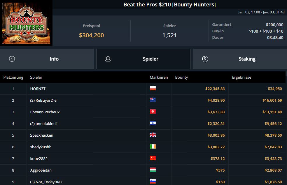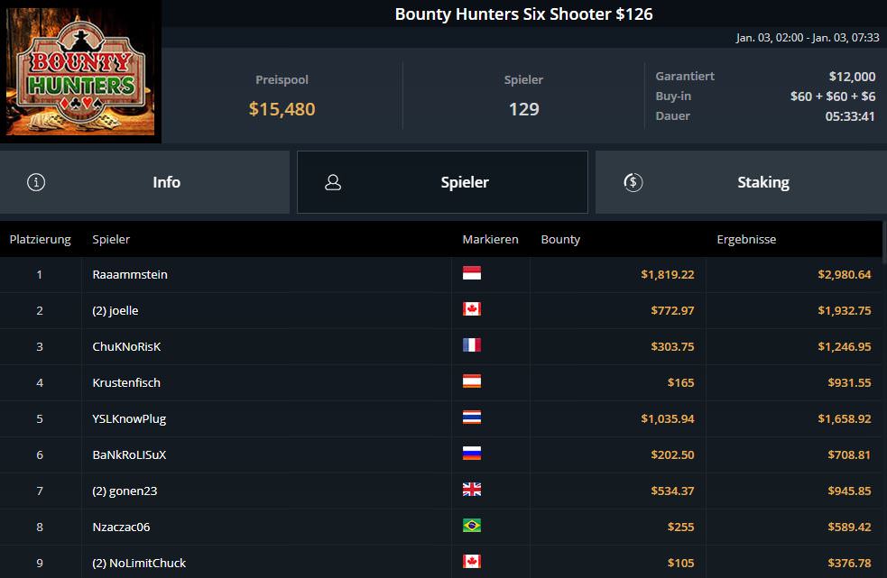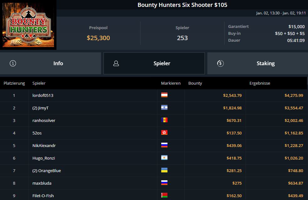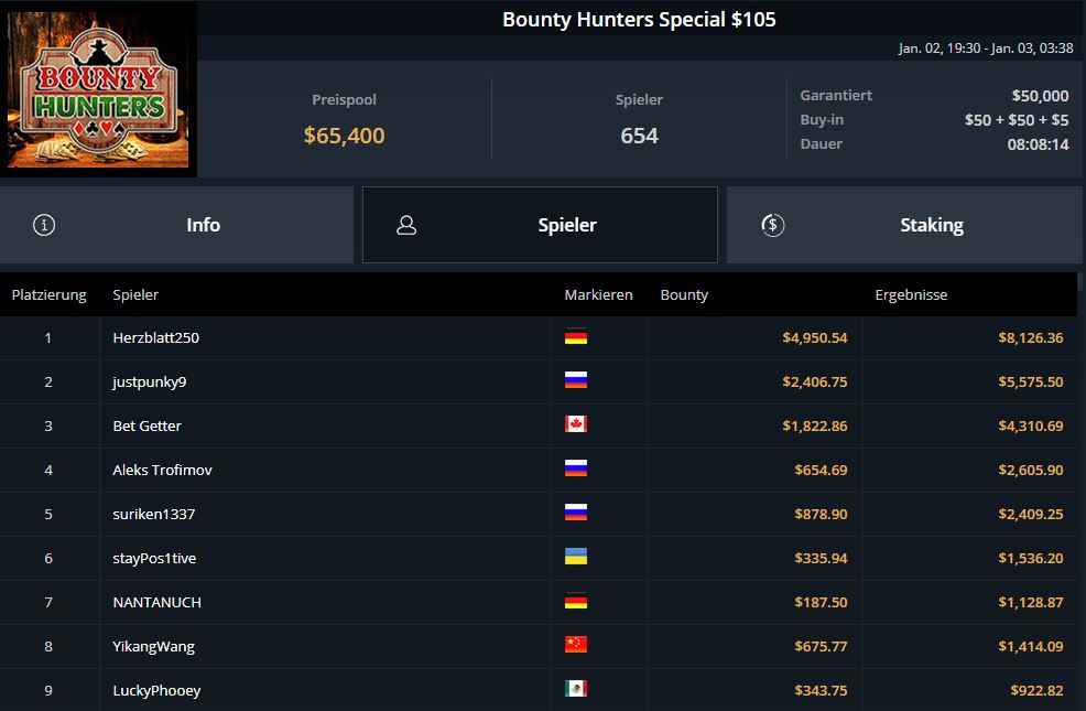 Ebenfalls siegreich war Herzblatt250. Beim $105 Bounty Hunters Special bekam der deutsche Pokerspieler für Platz eins inklusive Bounties sogar $8.126,36 ausbezahlt.
