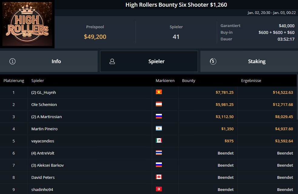 Ansonsten waren die DACH-Ergebnisse diesmal übersichtlich. Ole Schemion verpasste diesmal den Sieg beim $1.260 High Rollers Bounty Six Shooter, bekam als Runner-up aber immerhin $12.717,68 ausbezahlt.