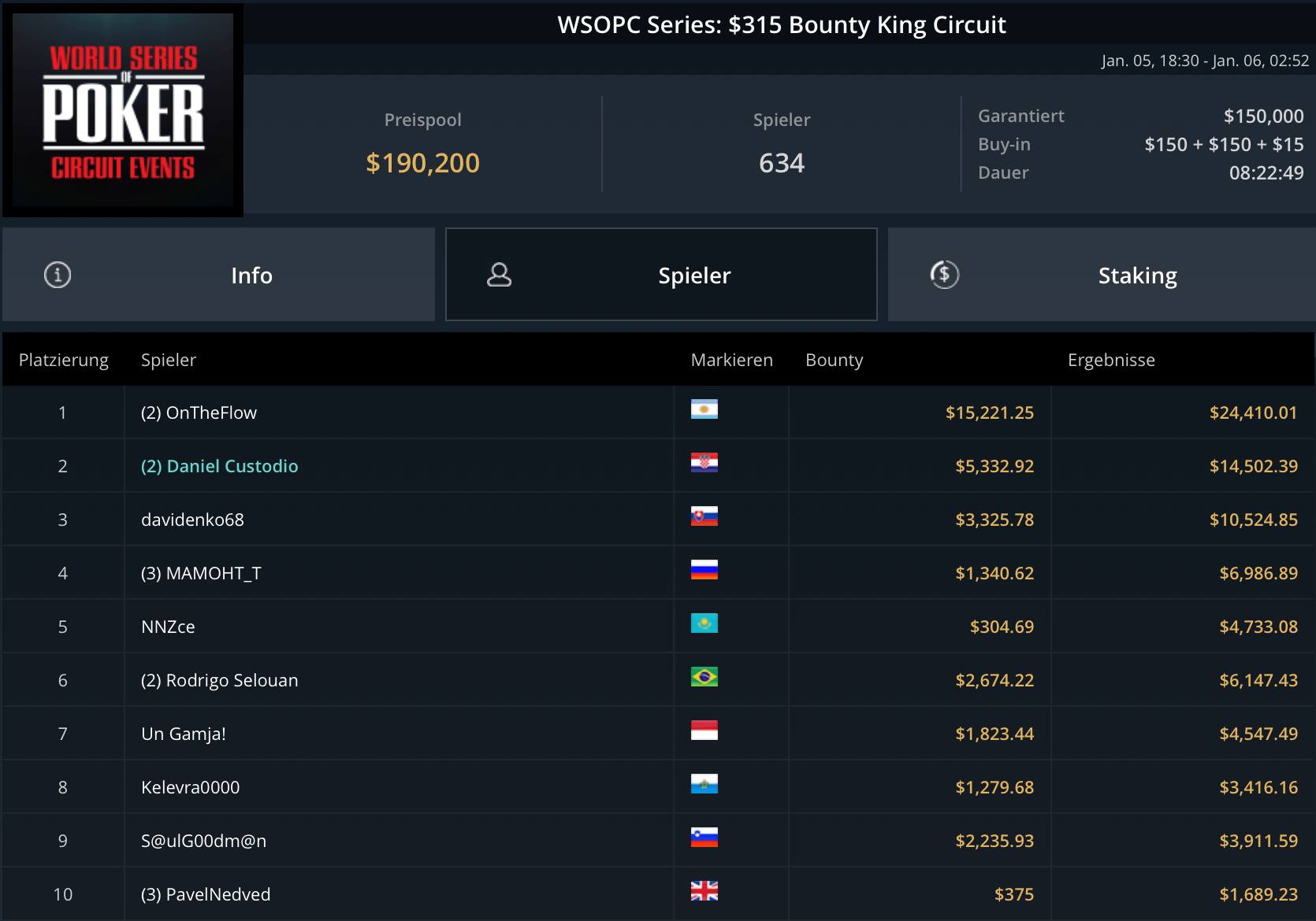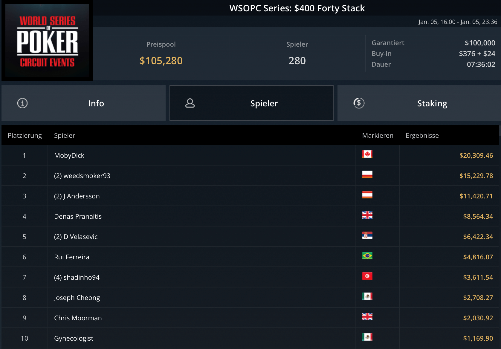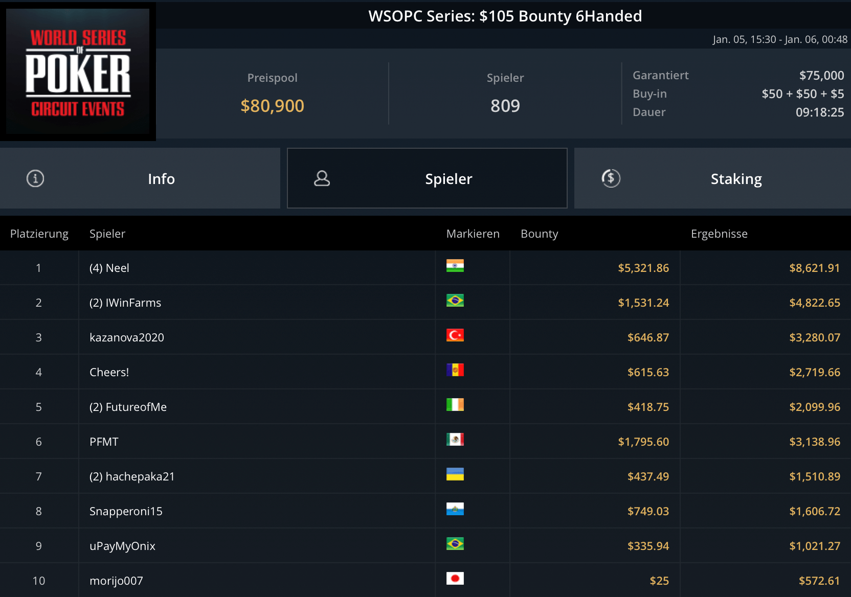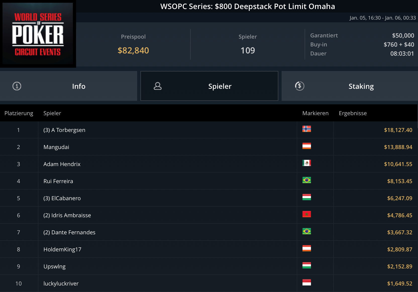 Weitere Ergebnisse der WSOPC auf GGPoker am 05.01.2021: