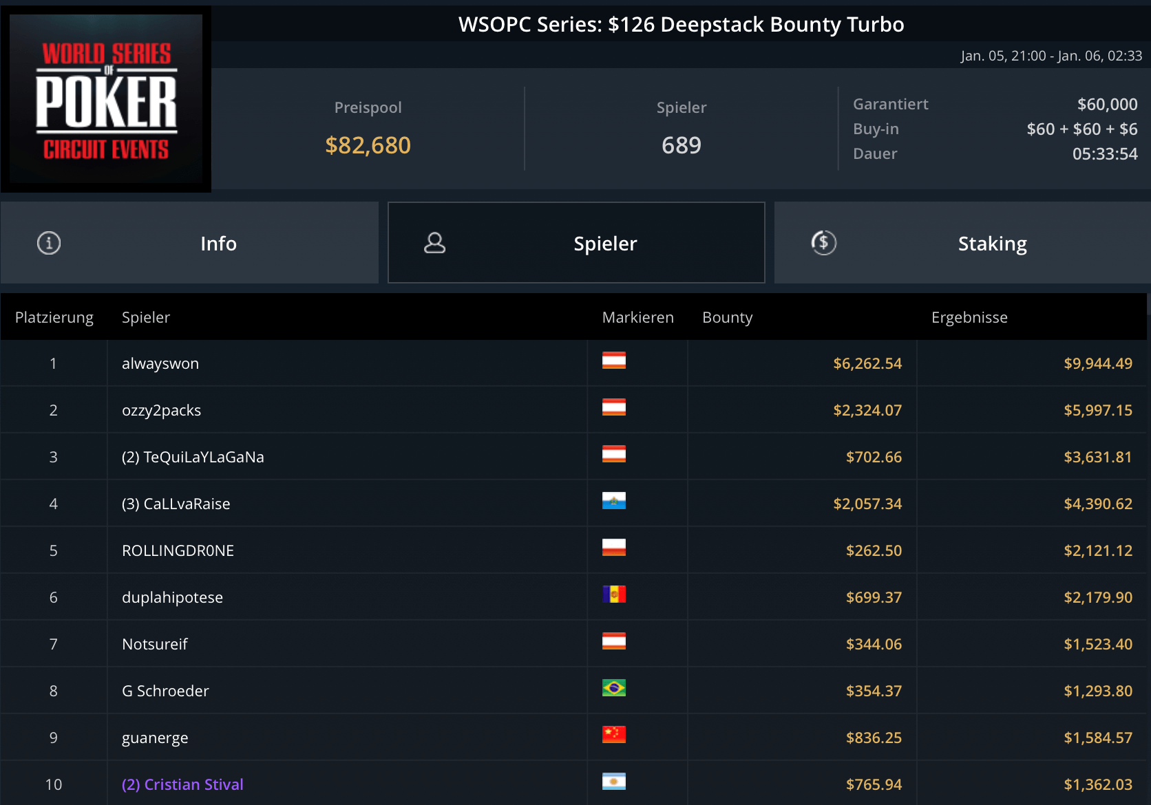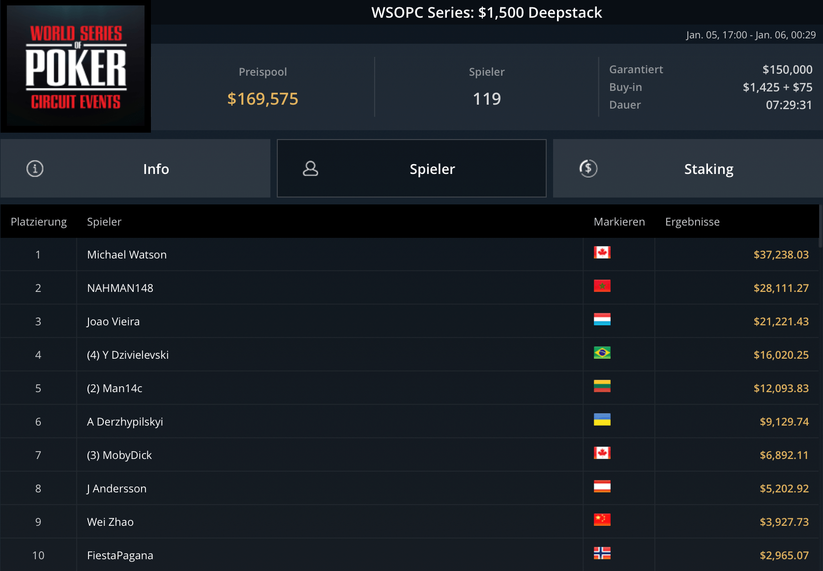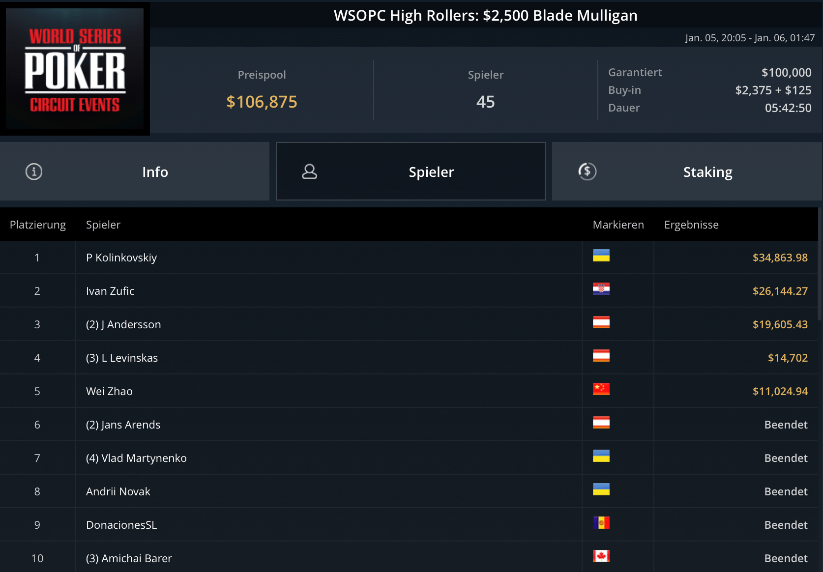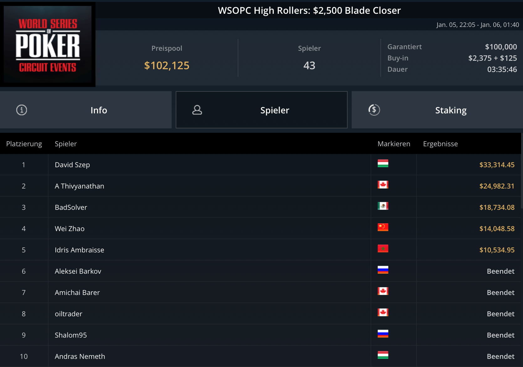 Weitere Ergebnisse der WSOPC auf GGPoker am 05.01.2021: