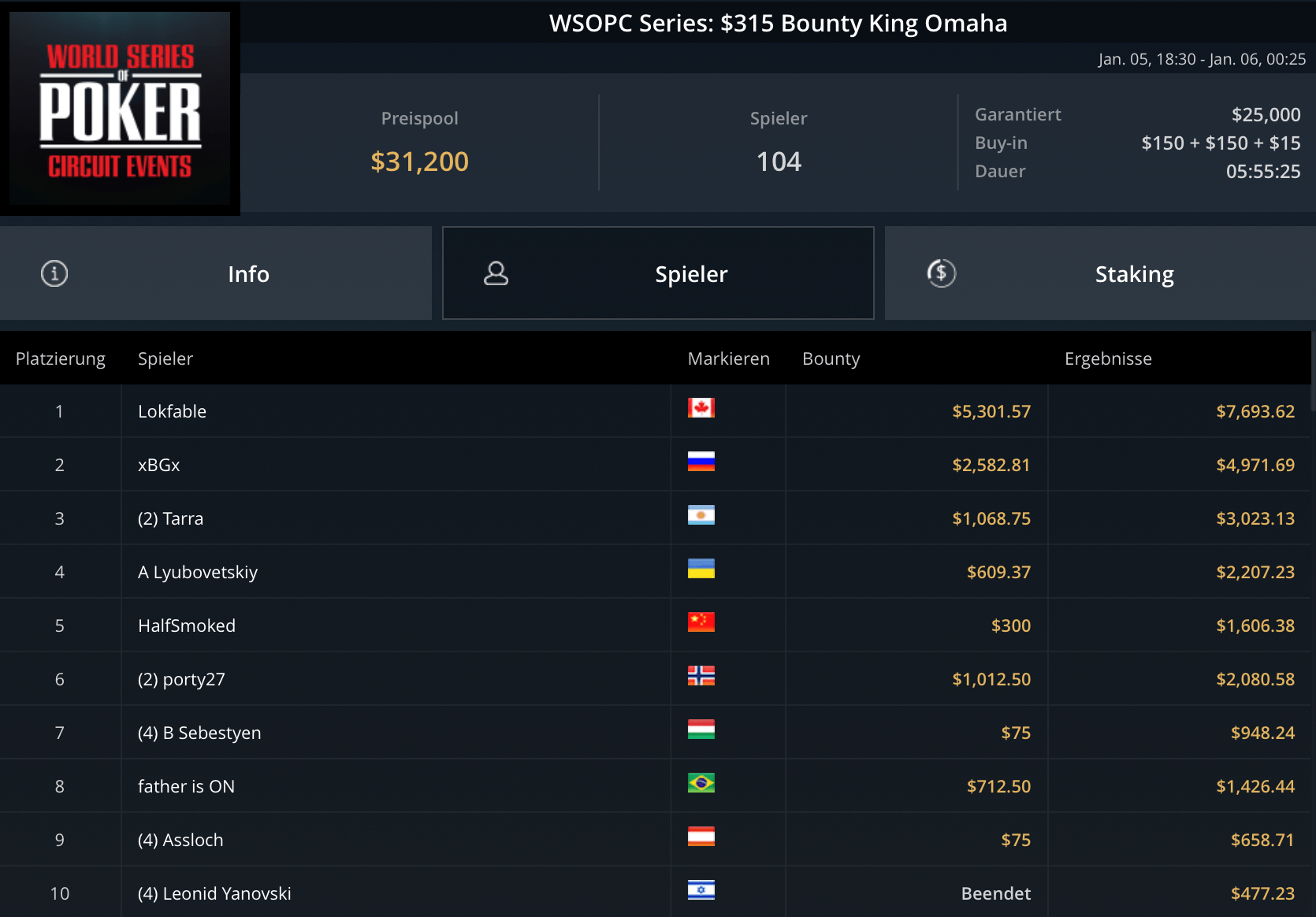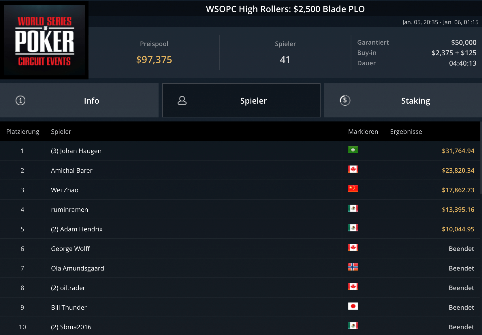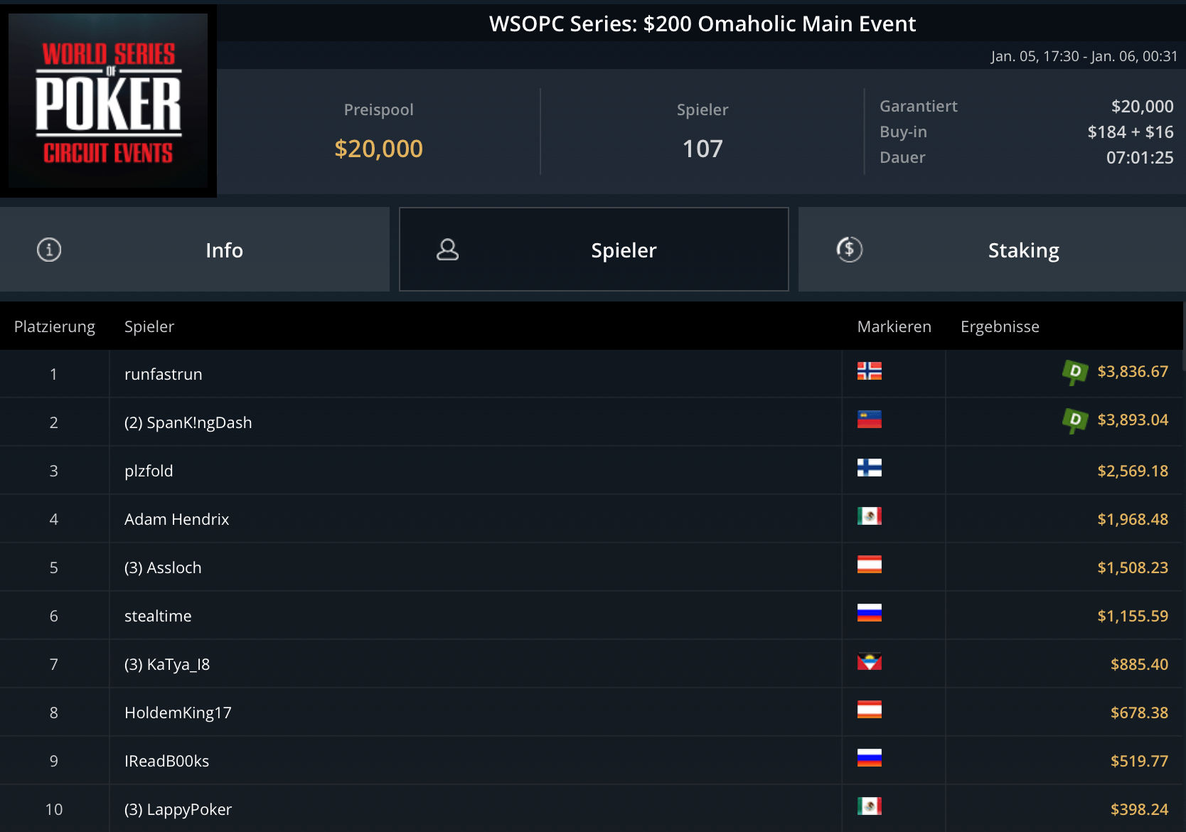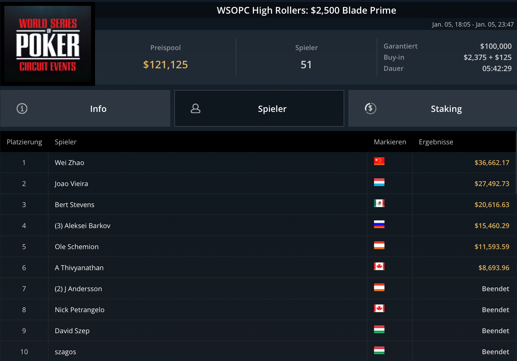Weitere Ergebnisse der WSOPC auf GGPoker am 05.01.2021: