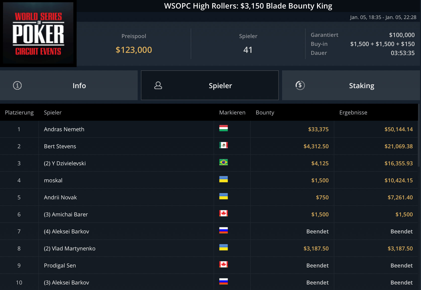 Andras Nemeth aus Ungarn schnappte sich den Sieg beim $3.150 Blade Bounty King vor Bert Stevens. Nemeth bekam für den Sieg $50.144, Stevens für den Runner-Up $21.069.