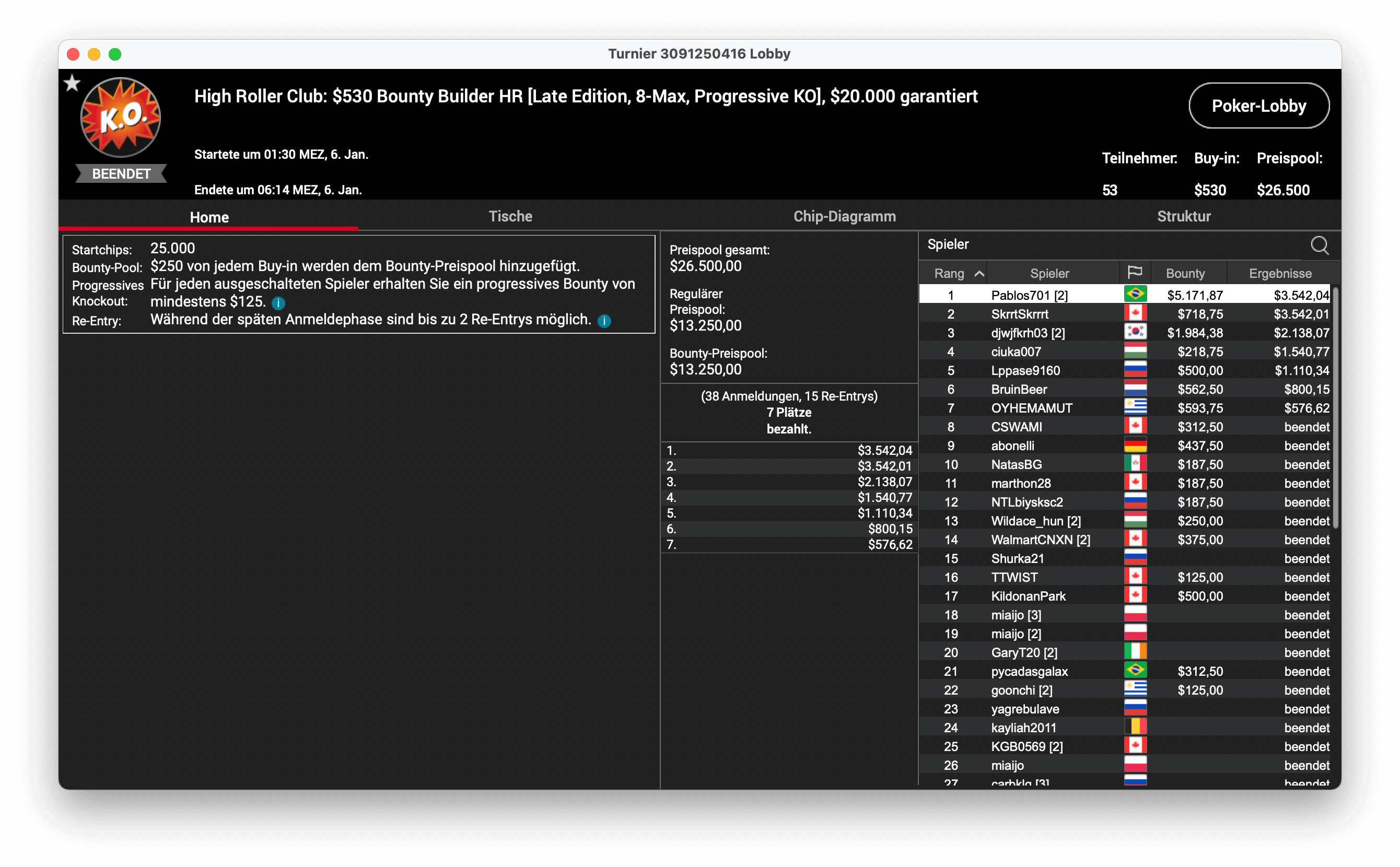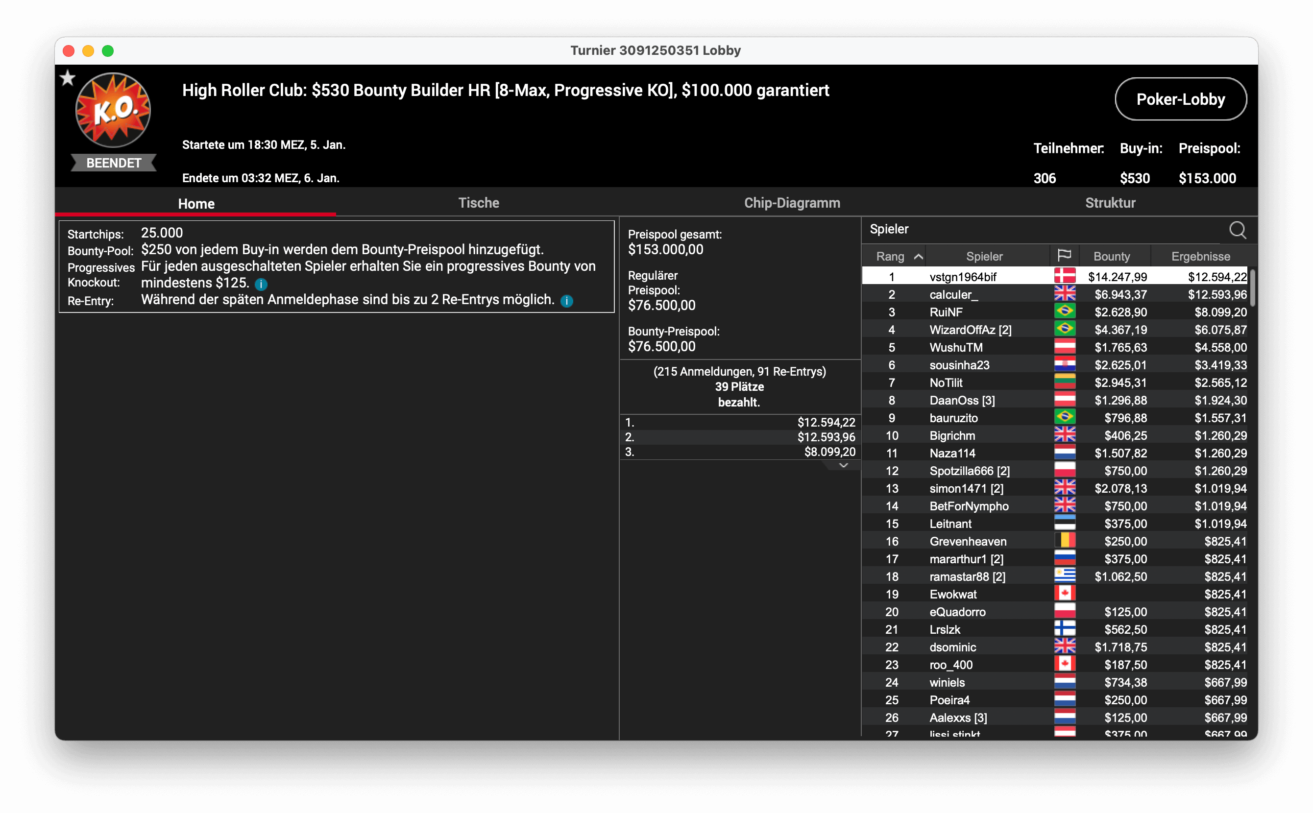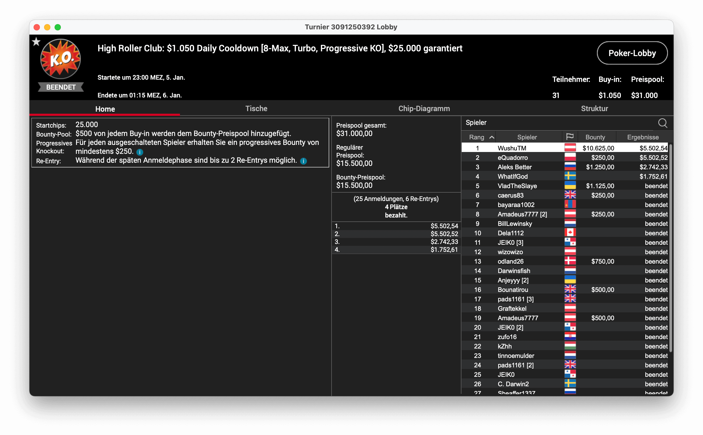Thomas Mühlöcker gewann am Dienstag das $1.050 Daily Cooldown im High Roller Club. 31 Entries von 25 Spielern sorgen für $31.000 Preispool, wovon Mühlöcker mit $10.625 an Bounties und $5.502 für die Platzierung, sich fast die Hälfte einsackte.