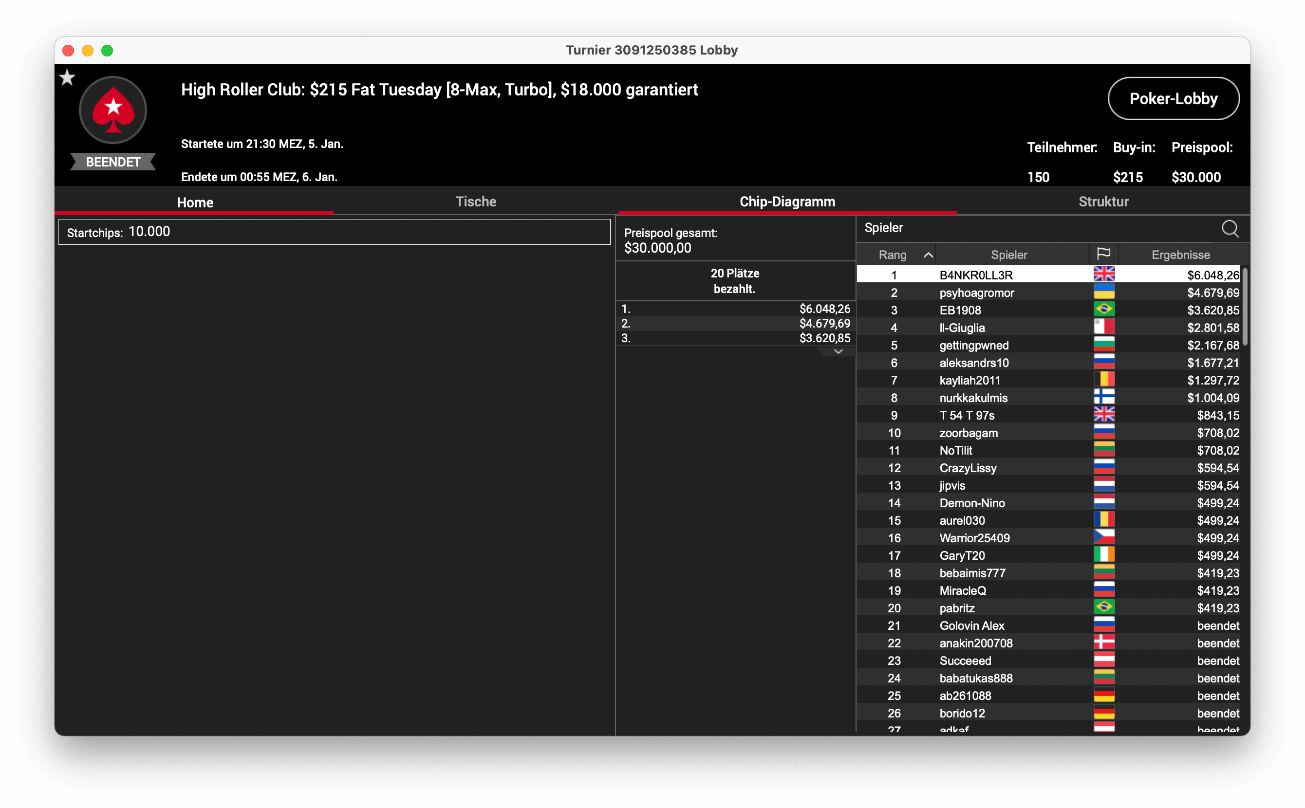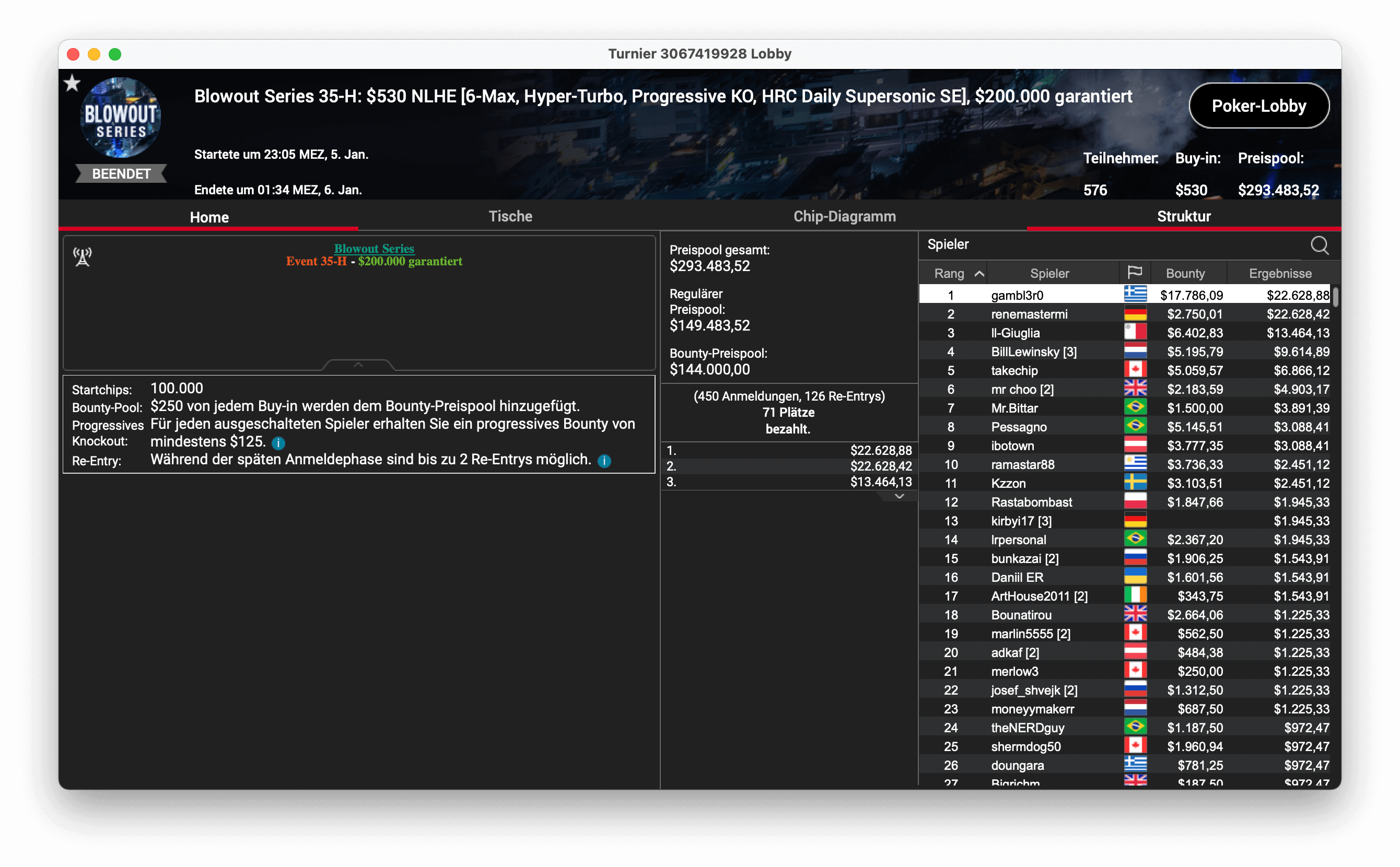 Beim Daily Supersonic SE – gestern sowohl im Rahmen des High Roller Club als auch in der Blowout Series stattgefunden – kamen 576 Entries zusammen, um sich um die Löwenanteile des $293.483 Preispool zu duellieren. Den Sieg holte sich der Grieche „gambl3r0“ für insgesamt über $30k vor dem deutschen Twitch-Streamer „renemastermi“, der als Runner-Up mit knapp $25k aus dem Turnier ging.