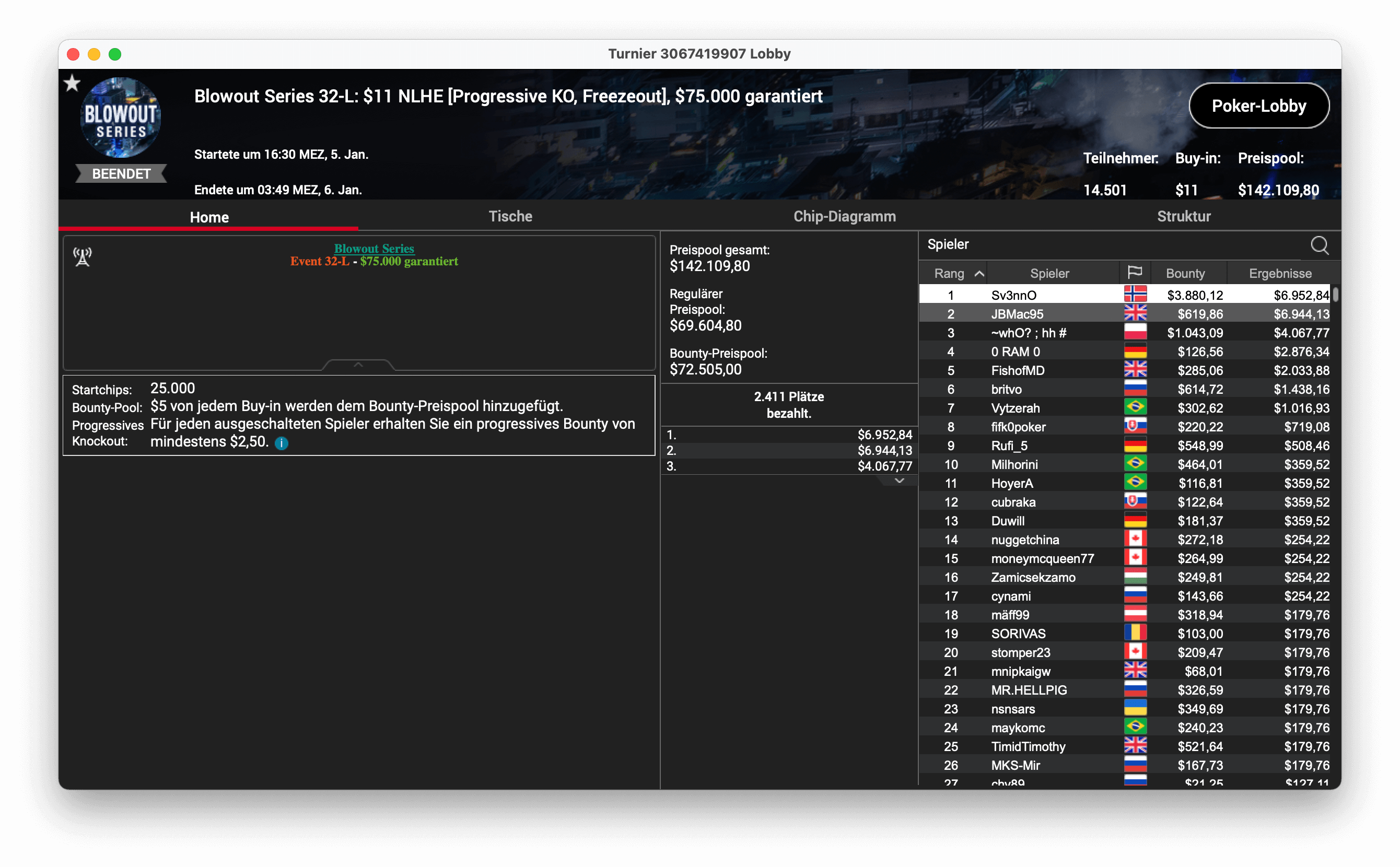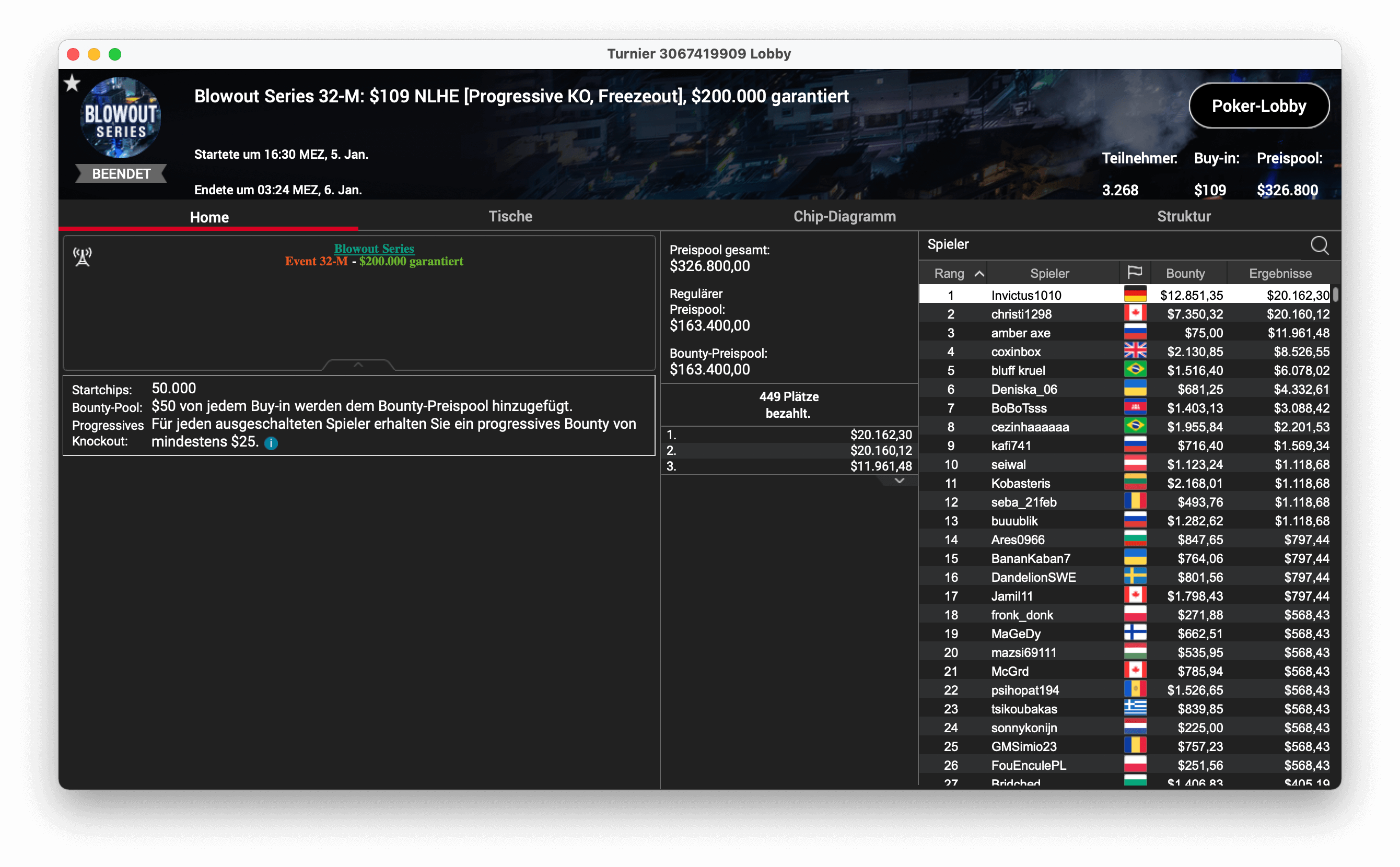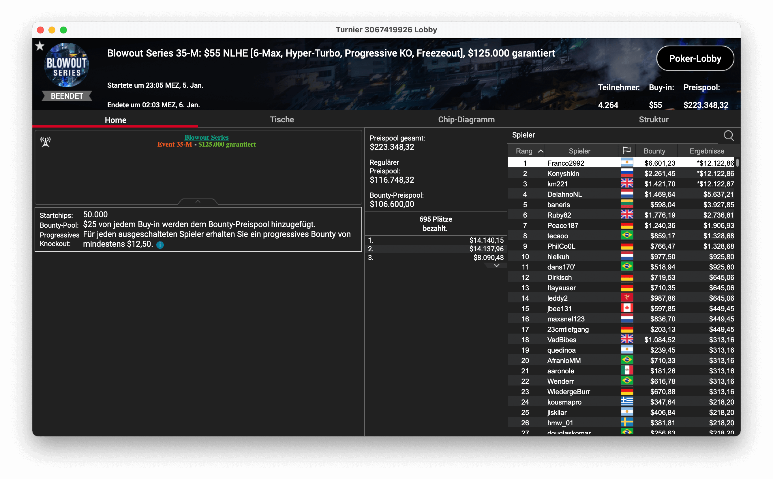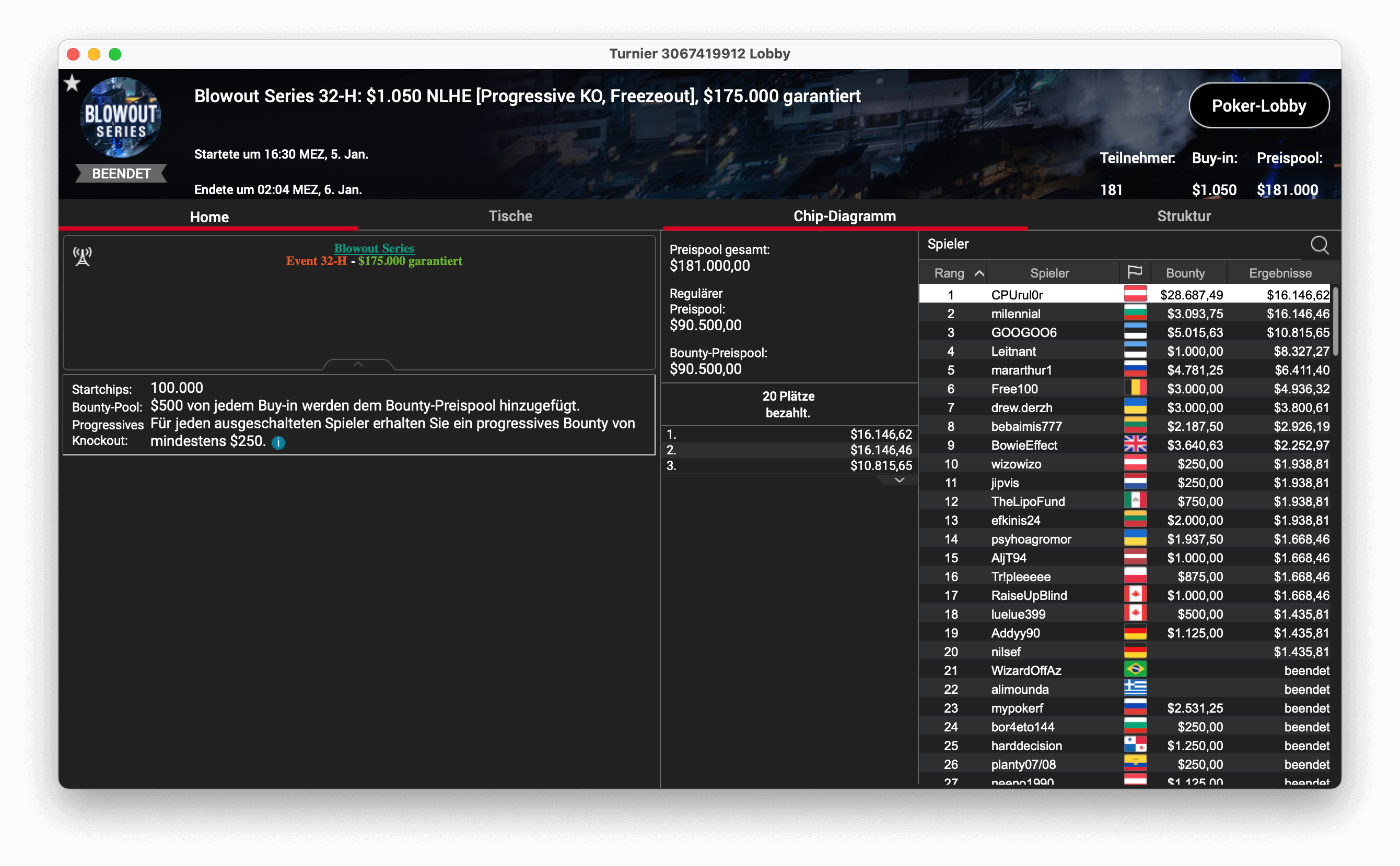 Und der dritte Titel ging an „CPUrur“ in Österreich, er gewann das 32-H, $1.050 Progressive KO, mit $181.000 Preispool. Es gab $28.687 mit Bounties und $16.146 für die Platzierung.