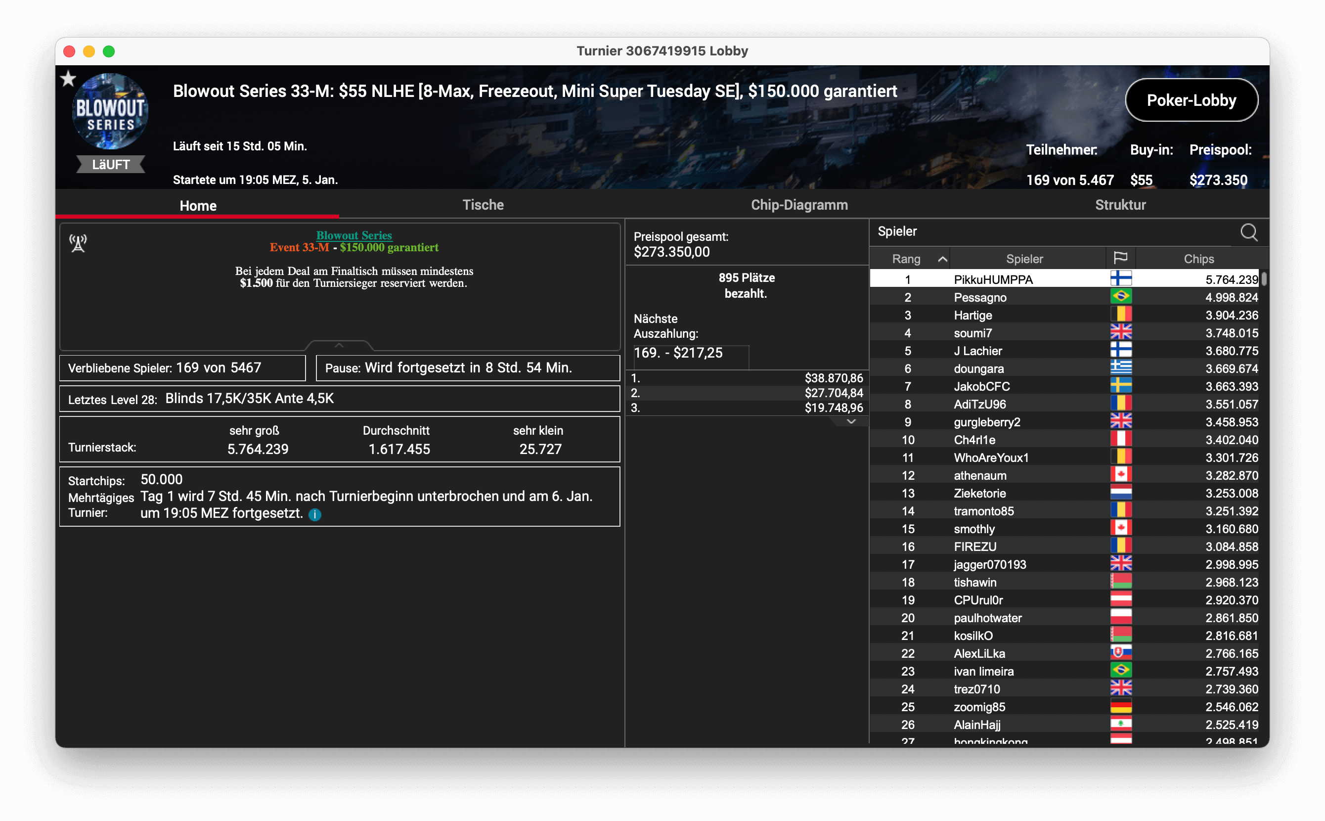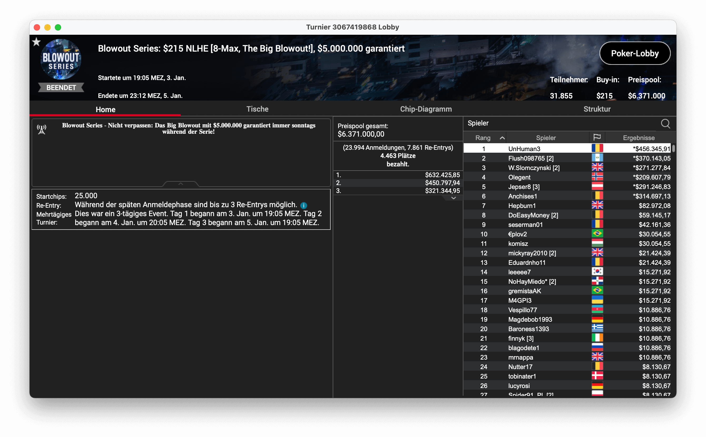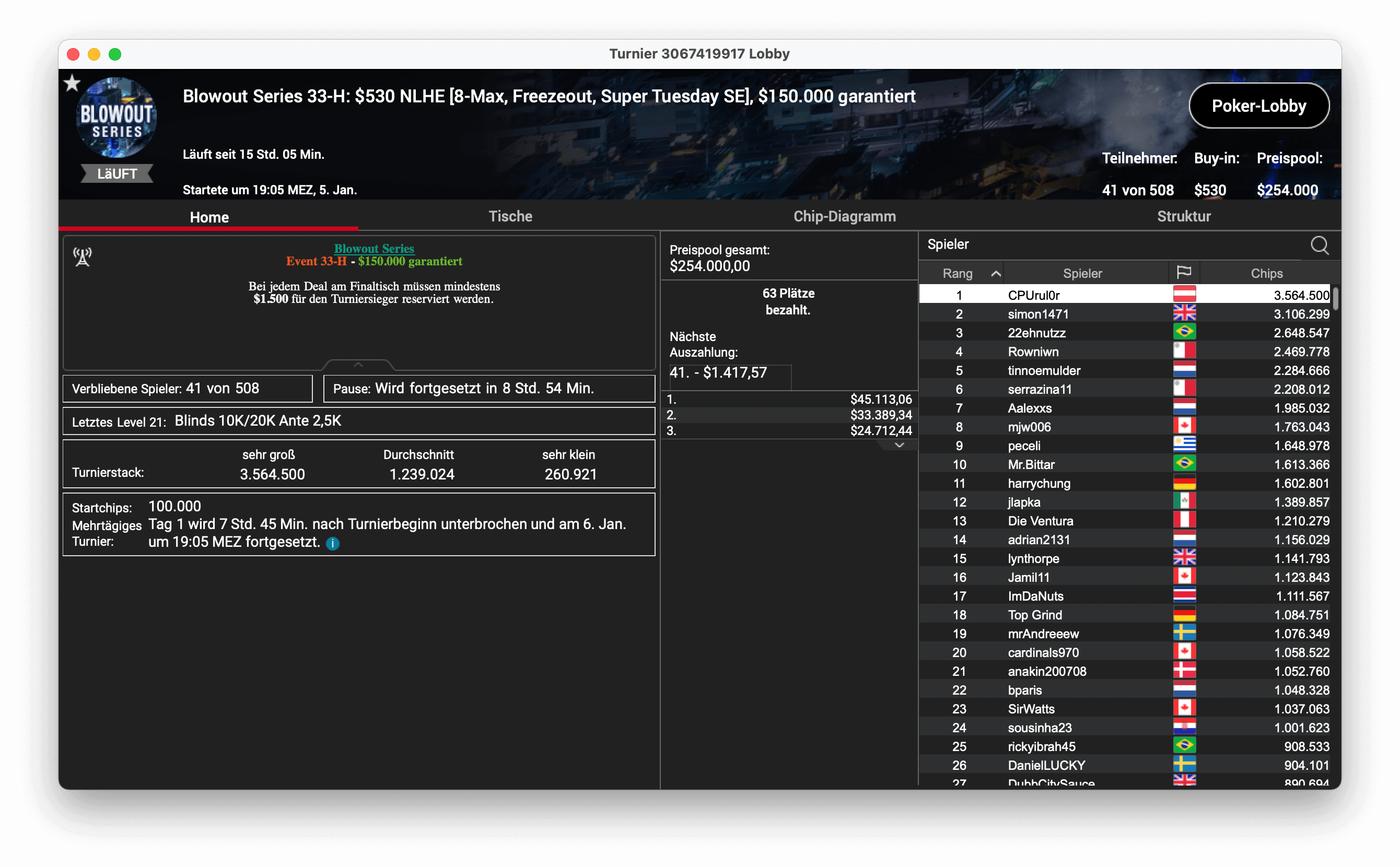 Und der dritte Titel ging an „CPUrur“ in Österreich, er gewann das 32-H, $1.050 Progressive KO, mit $181.000 Preispool. Es gab $28.687 mit Bounties und $16.146 für die Platzierung.