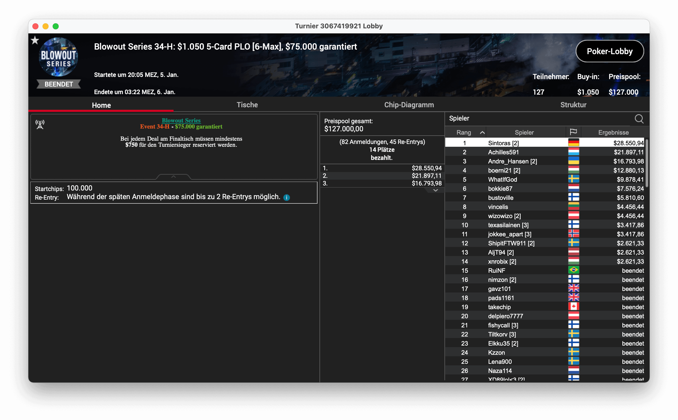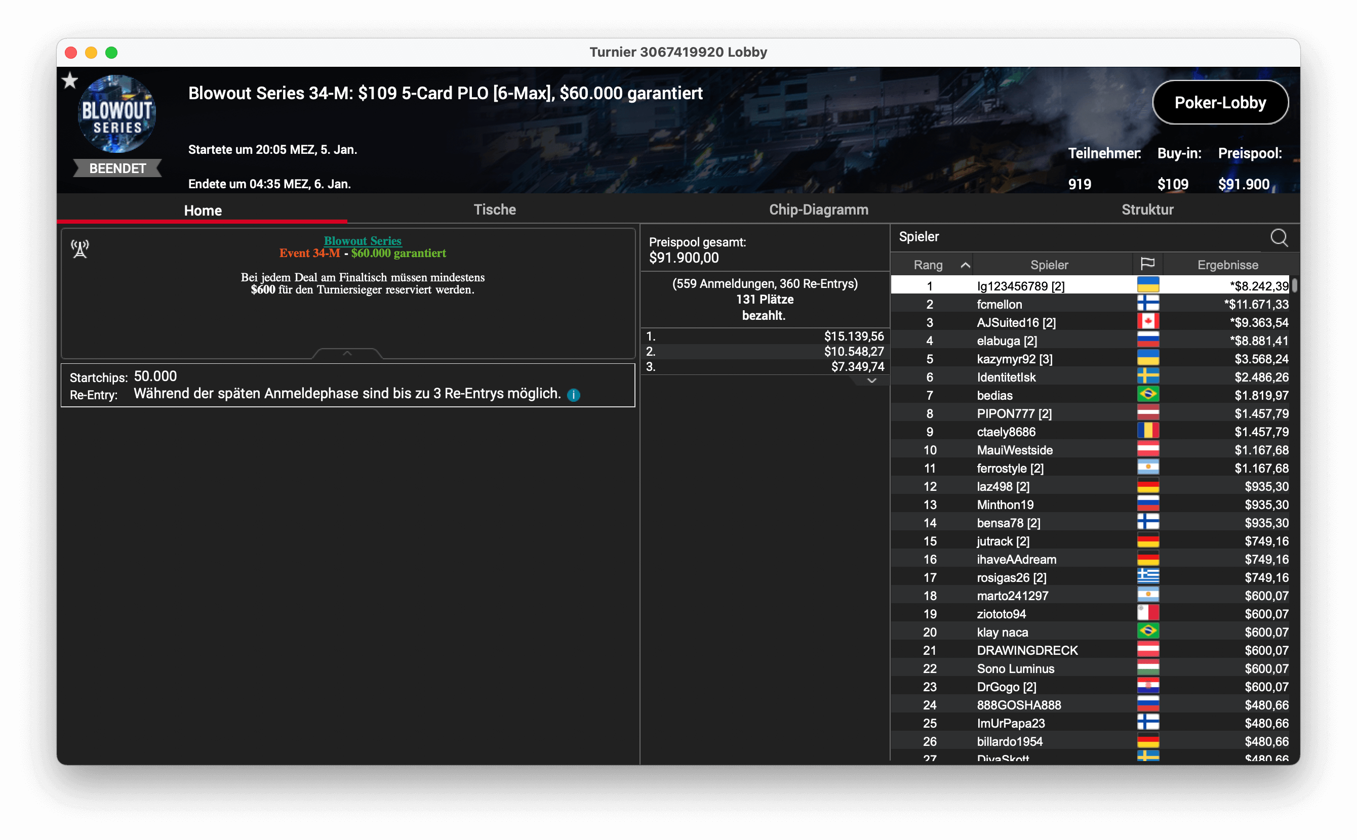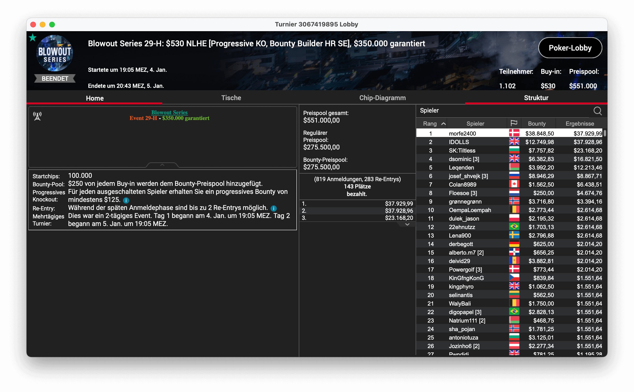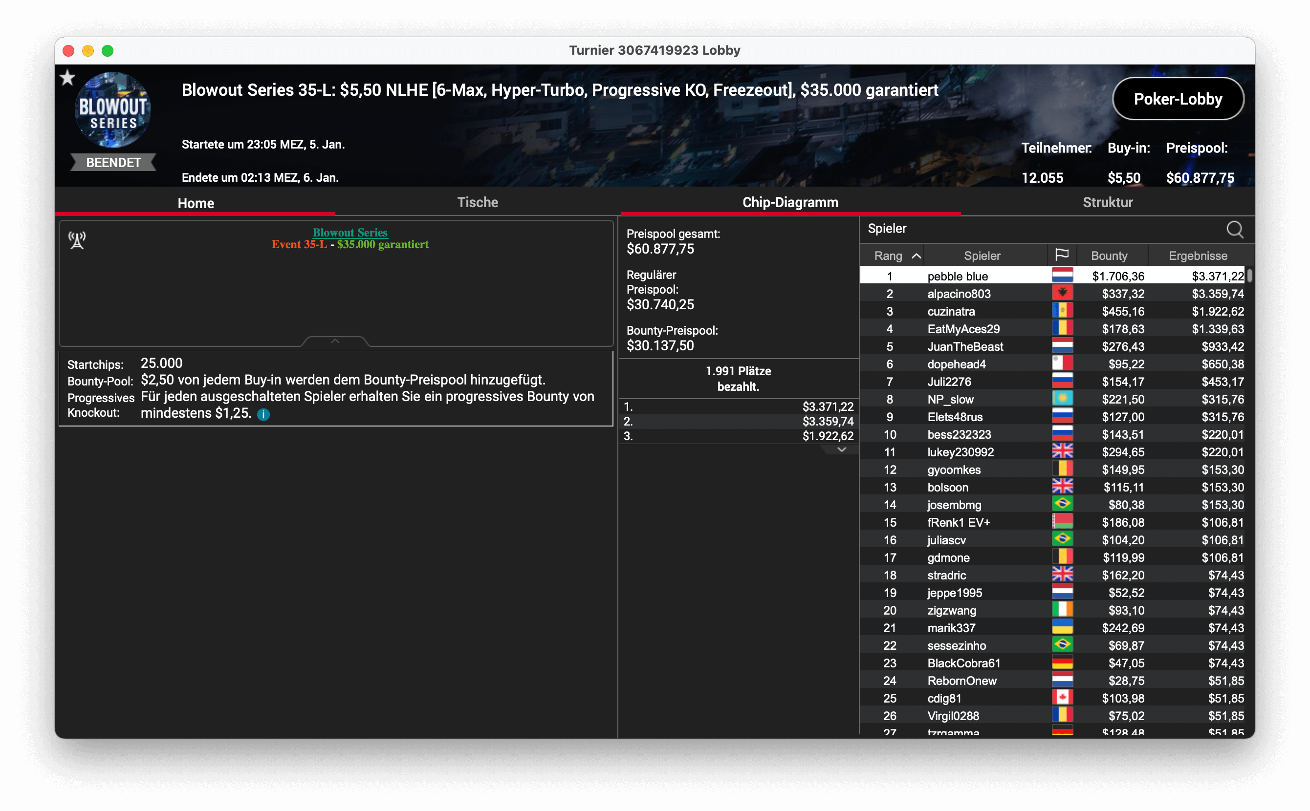 Und der dritte Titel ging an „CPUrur“ in Österreich, er gewann das 32-H, $1.050 Progressive KO, mit $181.000 Preispool. Es gab $28.687 mit Bounties und $16.146 für die Platzierung.