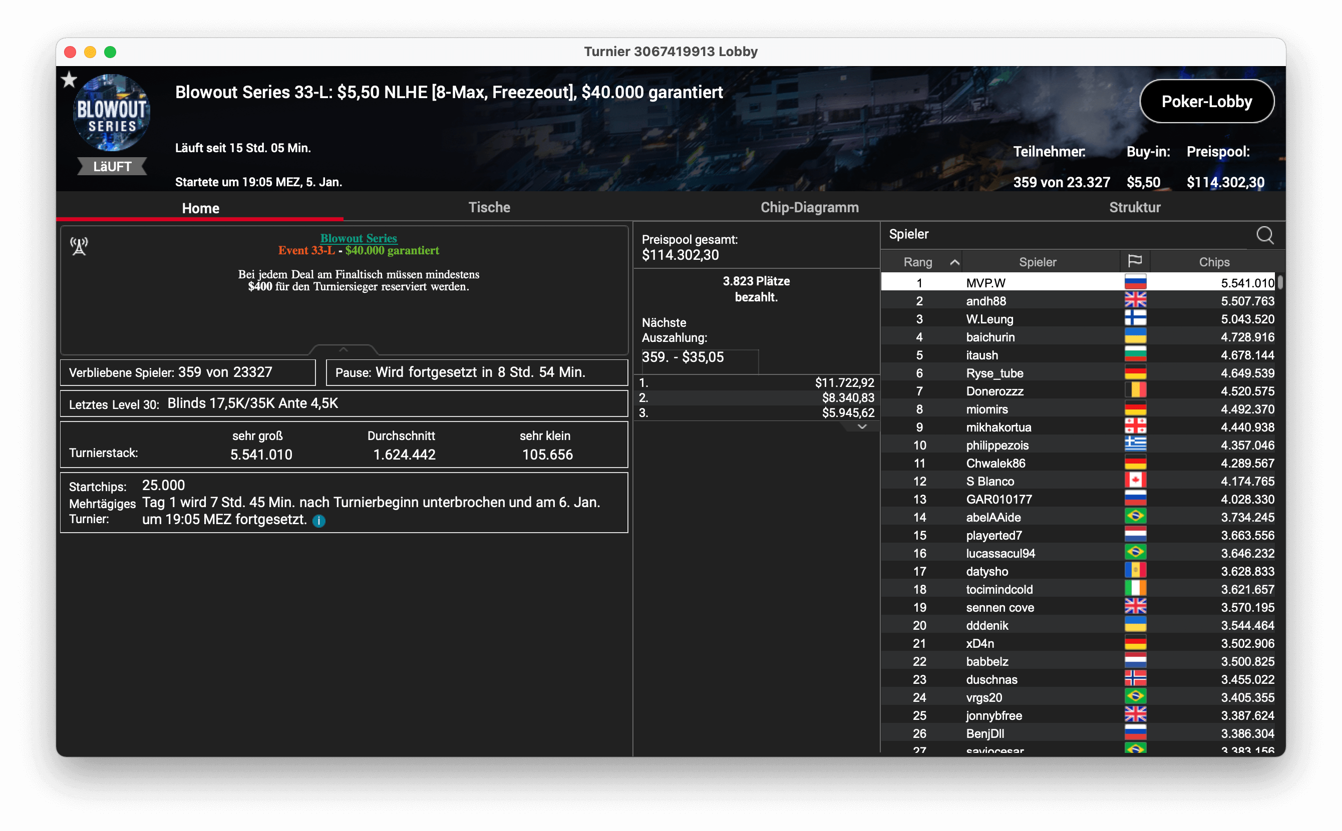 Den zweiten DACH-Sieg gab es bei Event 32-M, einem $109 NLHE, mit 3.368 Entries. „Invictus100“ schnappte sich den Sieg für $12.851 an Bounties und $20.162 mit der Platzierung.
