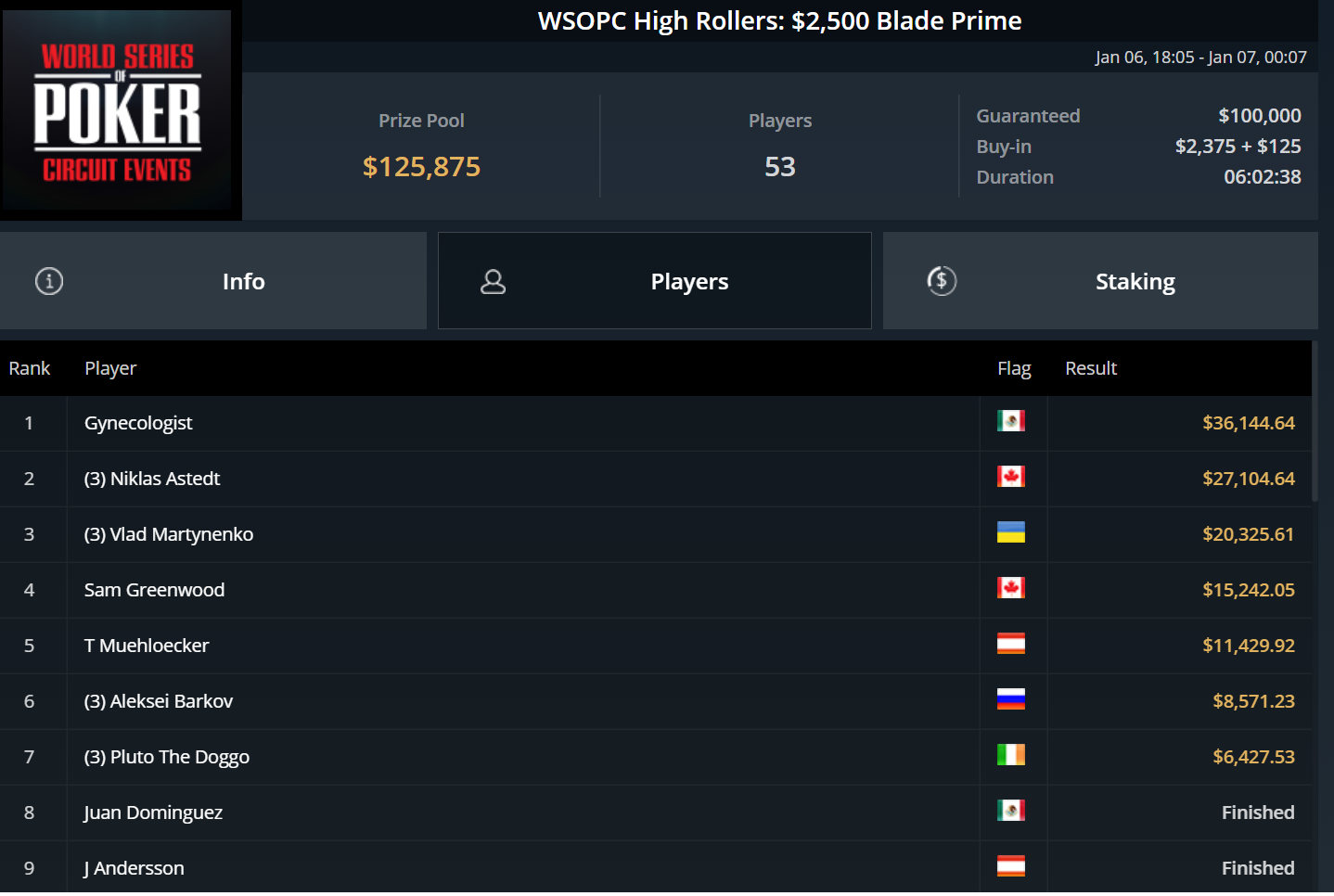 Zu den Gewinnern des Tages zählten Andras Nemeth, Sam Greenwood und Anatoly Filatov, der für seinen Sieg beim $3.150 Blade Bounty King knapp $50.000 und damit die größte Einzelsumme erspielte.