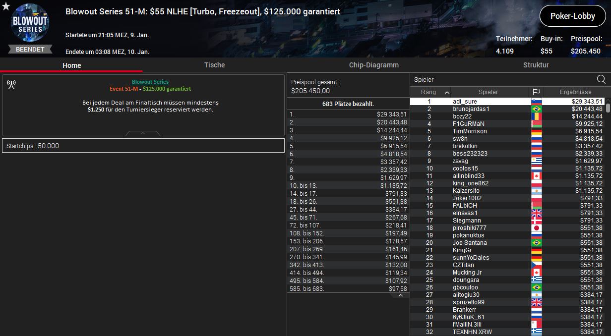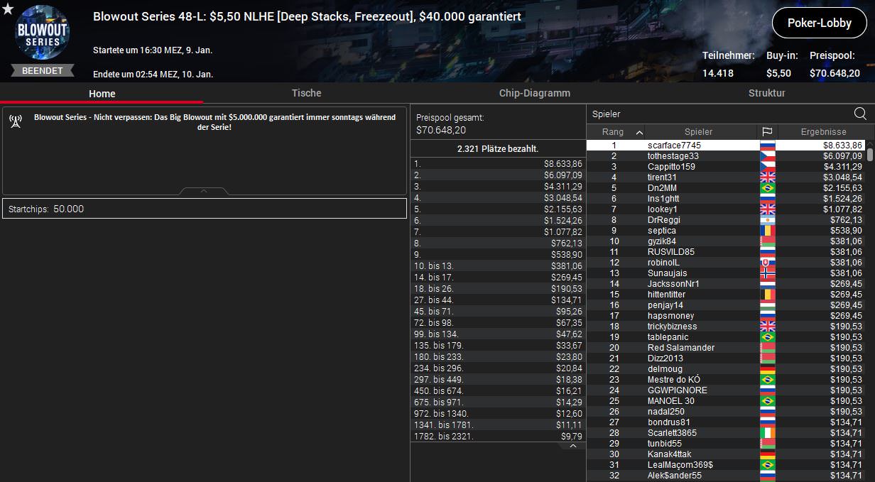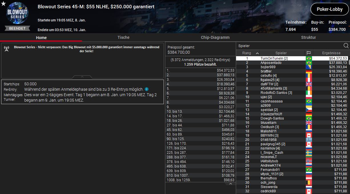 Außerdem konnte noch brattler beim $55 NLHE (45-M) mit Platz vier überzeugen. Bei diesem zweitägigen Turnier gab es 7.694 Entries und einen Preispool in Höhe von $384.700. Den Sieg und $54.372,53 Prämie holte der Brasilianer TurnOnTuneln vor seinem Landsmann Aaposentado ($37.880,13). Für brattler war zwar auf Platz vier Endstation, das Preisgeld betrug aber bereits $18.390,46.