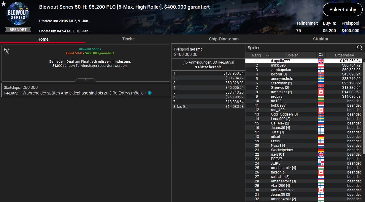 Groß aufgespielt hat auch Maxi mikki696 Lehmanski. Der Wahlösterreicher klopfte beim $5.200 PL Omaha 6-Max High Roller (50-H) ganz oben an, musste sich dann aber Heads-up dem Briten d.apollo777 ($107.963,84) geschlagen geben. Für Rang zwei kassierte Lehmanski aber satte $80.704,72 Preisgeld.