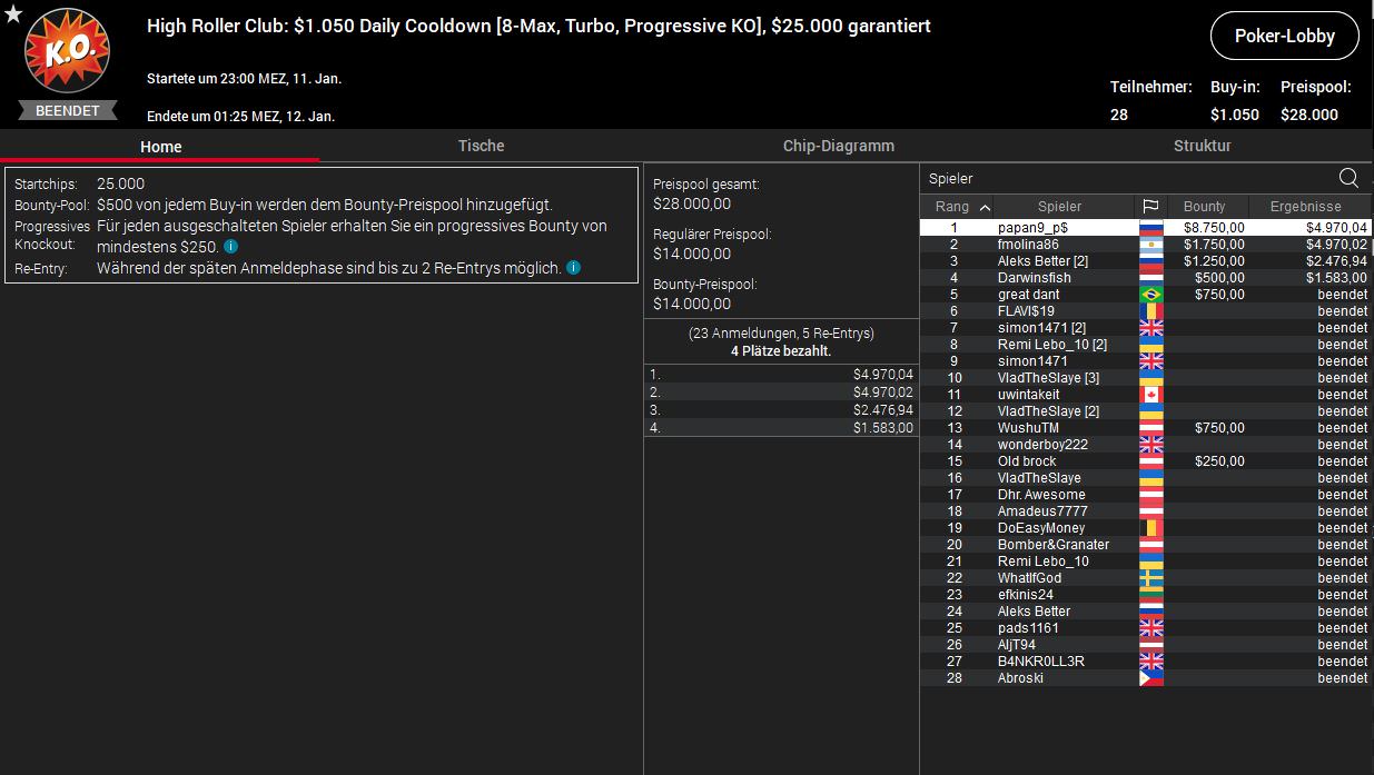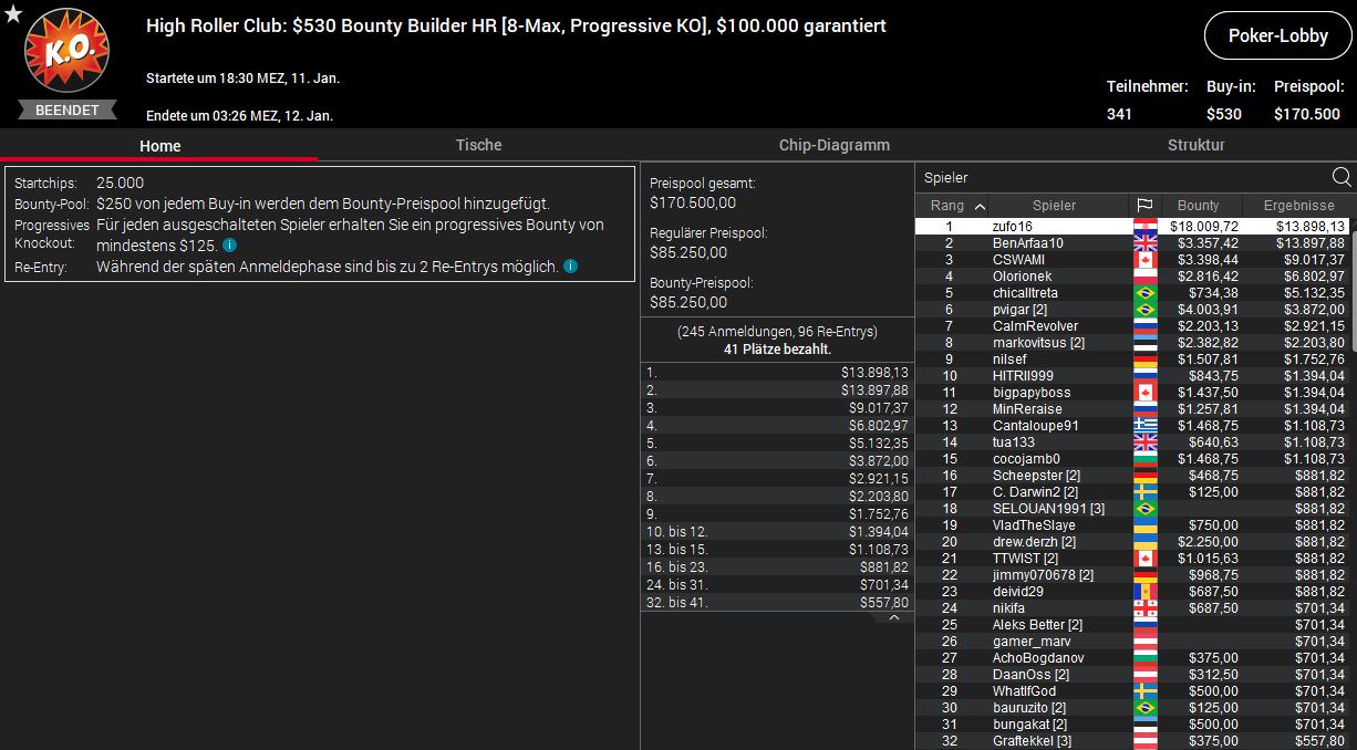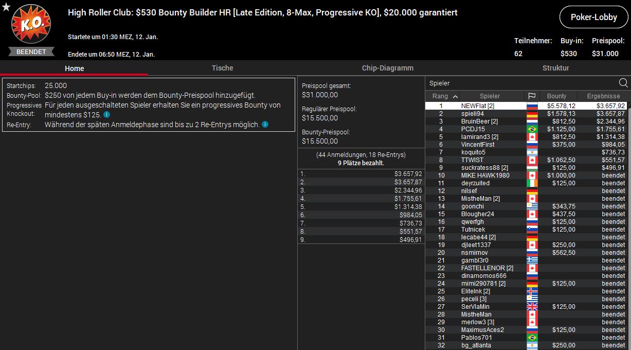 Ein weiteres Top-Ergebnis erzielte „spieli94“ bei der Late Edition des $530 Bounty Builder HR. Bei 62 Entries wurden hier $62.000 ausgespielt und Platz drei brachte „spieli94“ $3.657,92 Preisgeld plus $1.578,12 an Bounties. Den Sieg holte Regular Denis „NEWFlat“ Timofeev ($3.657,92/$5.578,12) aus Russland.