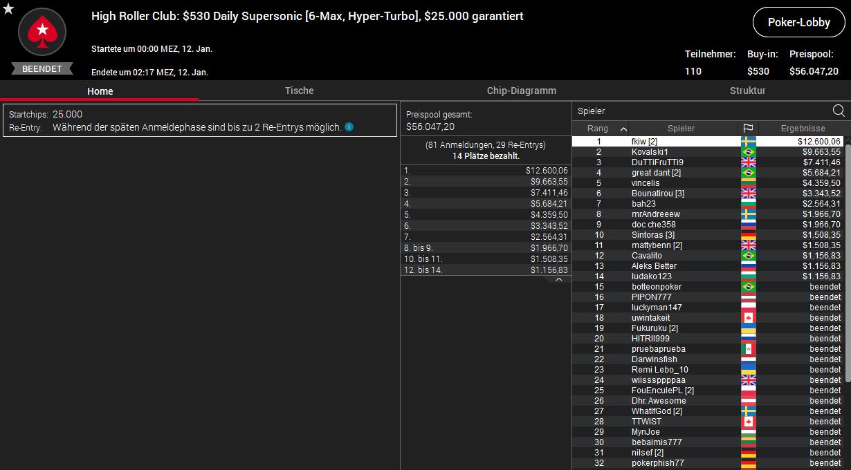 Ein Top-Ergebnis erzielte „DuTTiFruTTi9“ als Dritter für $7.411,46 beim $530 Daily Supersonic. Außerdem belegte Dominik „Bounatirou“ Nitsche Platz sechs für $3.343,52. Der Sieg ging an den Schweden „fkiw“ ($12.600,06).