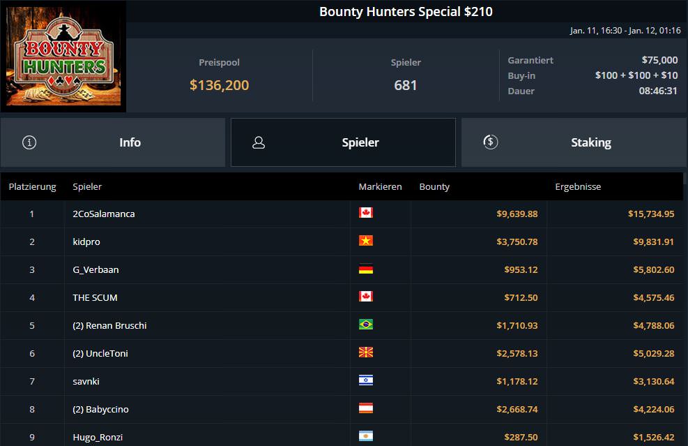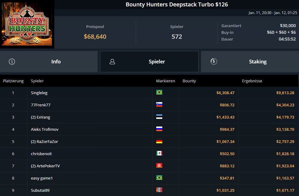 G_Verbaan war beim $300 Marathon erfolgreich. Hier ging es bei 172 Entries um insgesamt $47.988, die Siegprämie von G_Verbaan betrug $10.727,60. Der Deutsche hatte aber noch mehr zu bieten, gewann weitere $4.660 durch den Sieg beim $52,50 Bounty Hyper Special sowie $5.802 für Rang drei beim $210 Bounty Hunters Special.