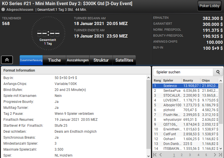 Immerhin fast $46.000 Preisgeld gab es für „Scelevco“ beim Mini Main Event, das er als Sieger vor 3.822 Konkurrenten beendete.