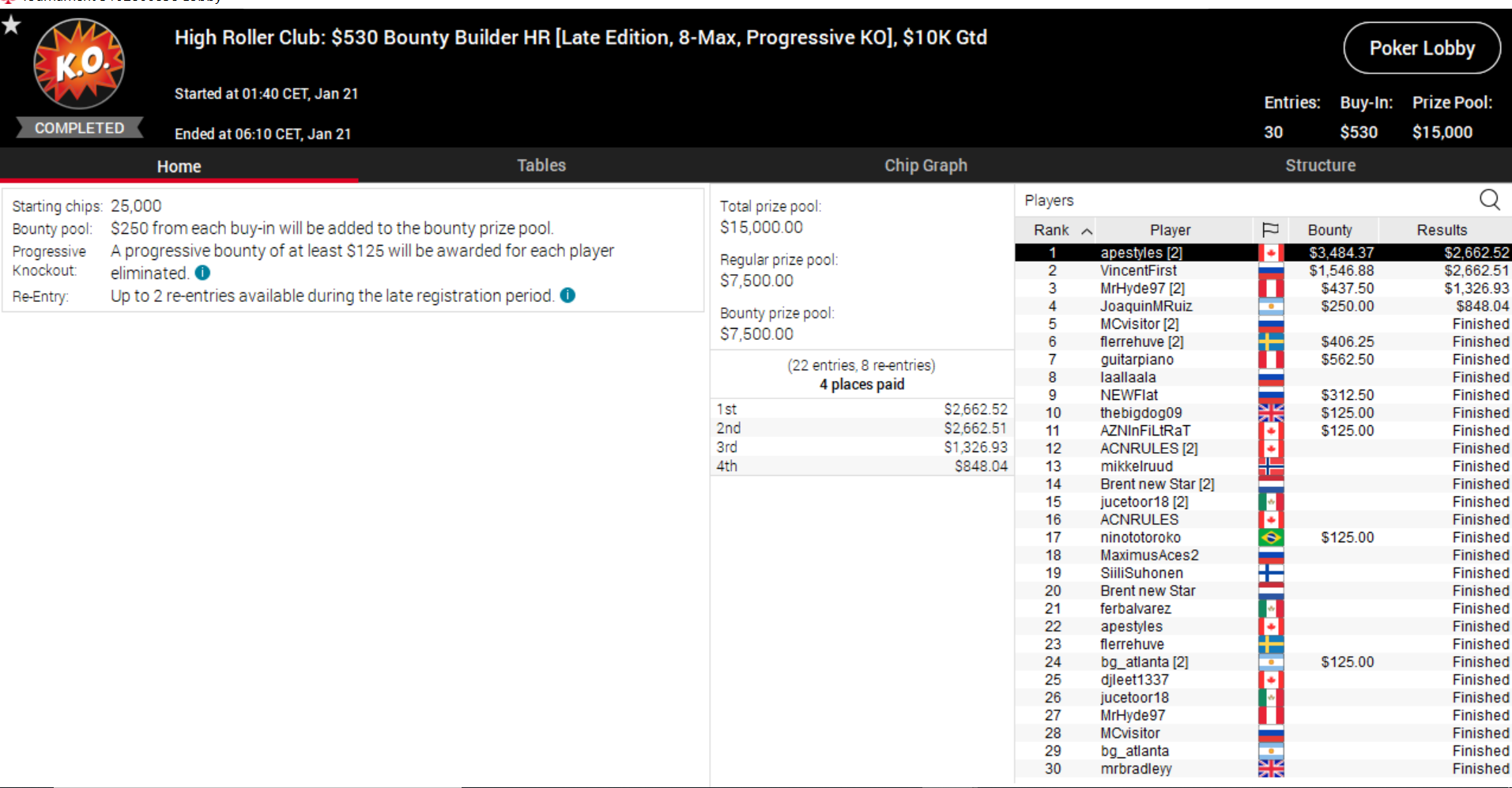 Einen weiteren Sieg für einen Wahlkanadier holte Jon „apestyles“ van Fleet, der sich in den frühen Morgenstunden beim $530 Bounty Builder Late Edition durchsetzte und rund $6.000 abräumte.