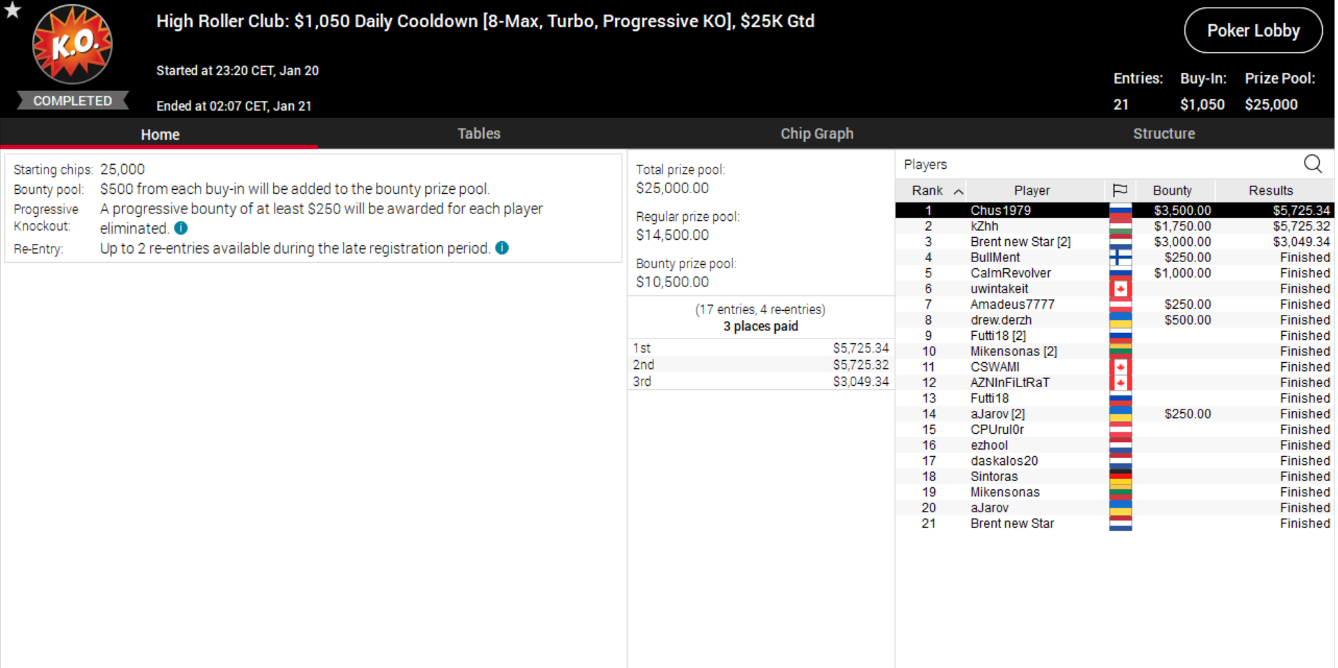 Vier Turniere wurden aber ausgetragen, und beim beliebten $530 Bounty Builder kamen immerhin 198 Entrys zusammen.