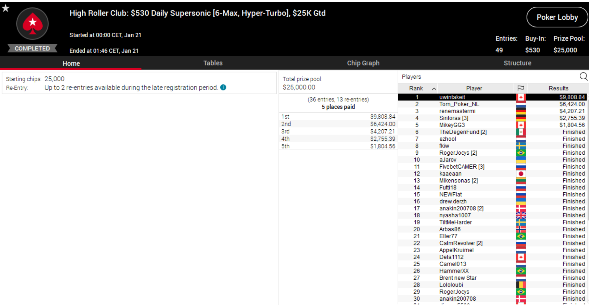 Aus deutschsprachiger Sicht war es fast ein Tag zum Vergessen, doch „Sintoras“ und „renemastermi“ schafften es beim $530 Supersonic um Mitternacht auf die Plätze 4 und 3.