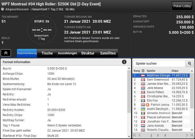 Bei der World Poker Tour Montreal Online 2021 auf partypoker hat der Österreicher Matthias Eibinger am Freitagabend seine Ausgangsposition als Chipleader beim High Roller Event genutzt und den Titel eingefahren. Außerdem fiel der Startschuss zum Montreal Masters.