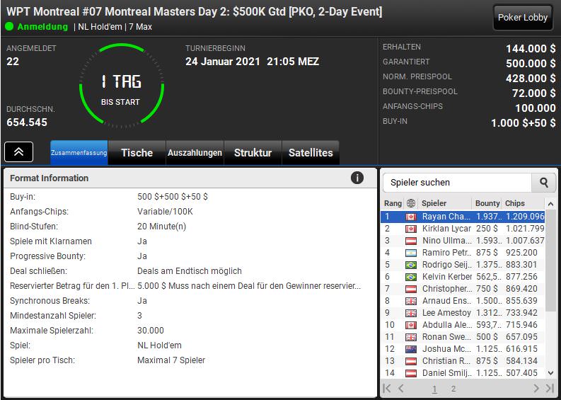 Beim ersten von drei Starttagen beim $1.050 Montreal Masters (#07) wurden 144 Entries gebucht, es fehlt also noch einiges, um die garantierten $500.000 an Preisgeldern zu erreichen. Für Spieltag 2, der am Sonntag um 21:05 Uhr beginnt sind die ersten 22 Spieler qualifiziert, In Führung liegen die beiden Kanadier Ryan Chamas und Kirklan Lycar, auf Rang drei folgt Nino Ullmann, Christopher Pütz ist Siebter. Ebenfalls qualifizierte sind Christian Rudolph, Daniel Smiljkovic, Matthias Neu und Lukas Wimmer.