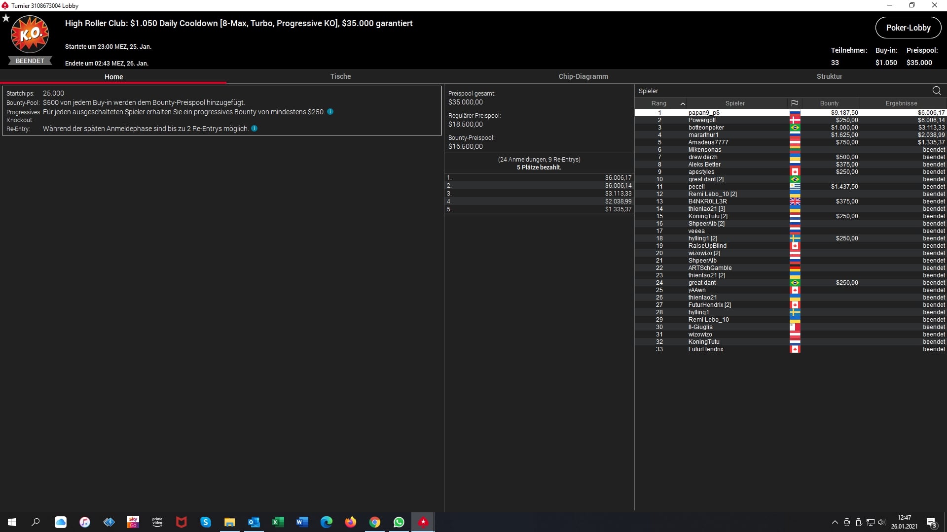 Das $1.050 Daily Cooldown konnte Viktor „papan9_p$“ Ustimov (RUS) für sich entscheiden und $6.006 + $9.187 Bounties abräumen. Gerade so ins Geld schaffte es „Amadeus7777“ aus Österreich auf Platz 5 für $1.335 + $750 Bounties.