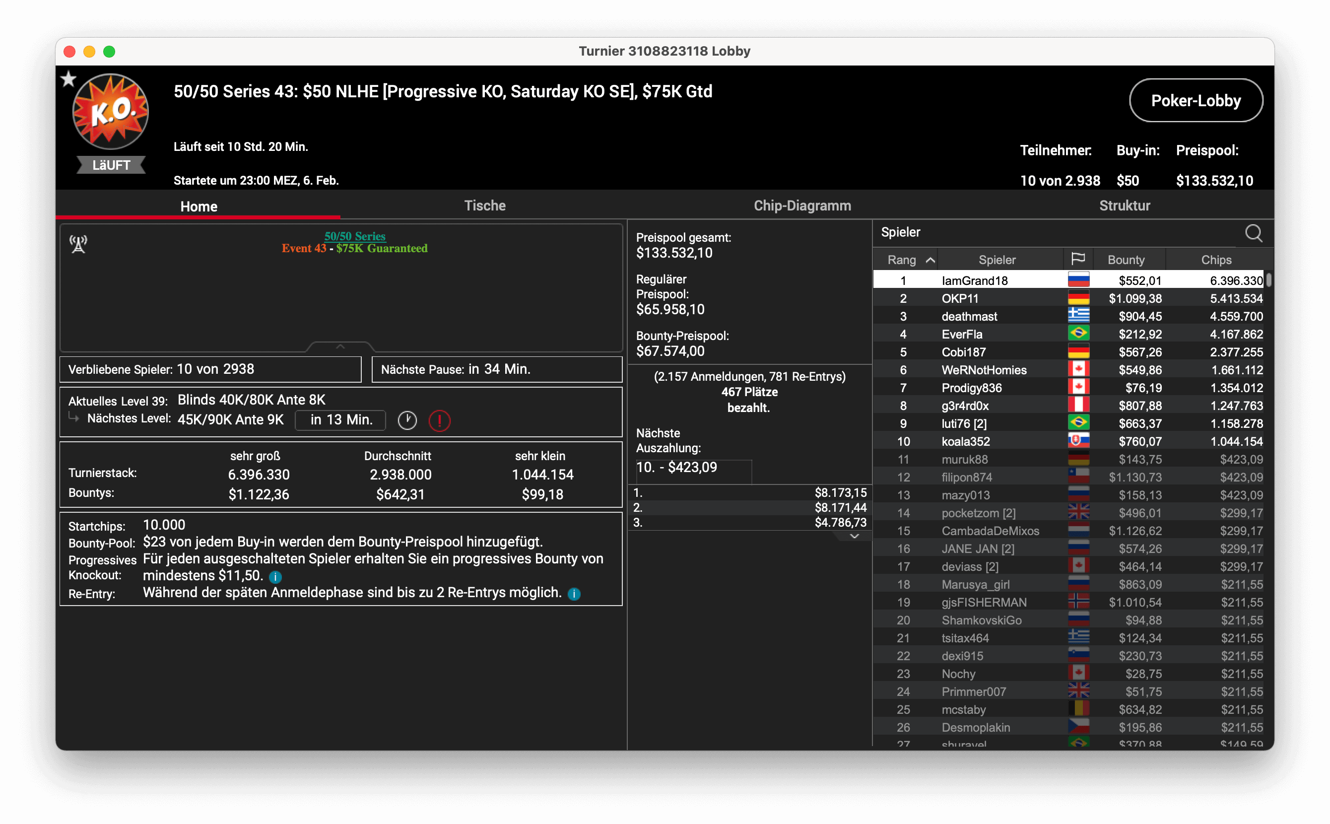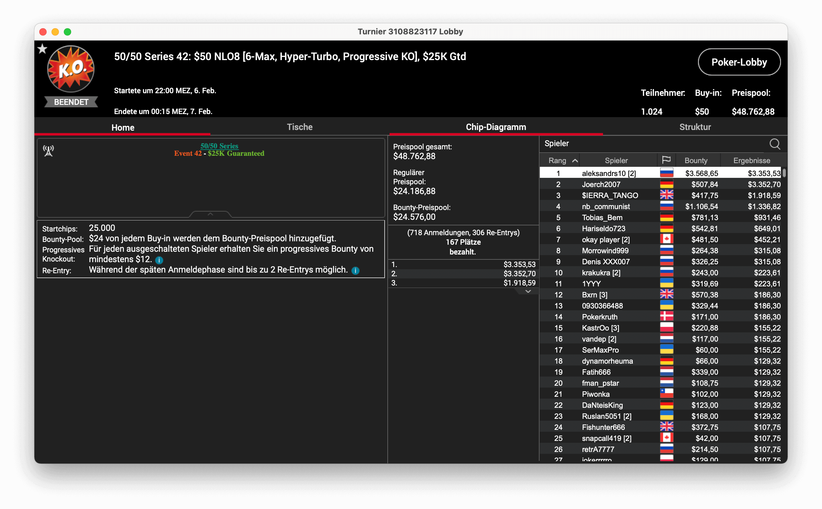 Event 42 war ein NLO8 alias Omaha Hi/Lo PKO Hyper-Turbo, bei dem 1.024 Entries für die besagten $50 zusammenkamen und so für einen $48.762 Preispool sorgten. Drei deutsche Spieler kamen an den Final Table, „Joerch2007“ schaffte es bis ins Heads-Up. Dort musste er sich gegen den Russen „aleksandrs10“ geschlagen geben, der knapp $7k mit seinem Sieg gewann. „Joerch2007“ durfte sich über $3,8k freuen.