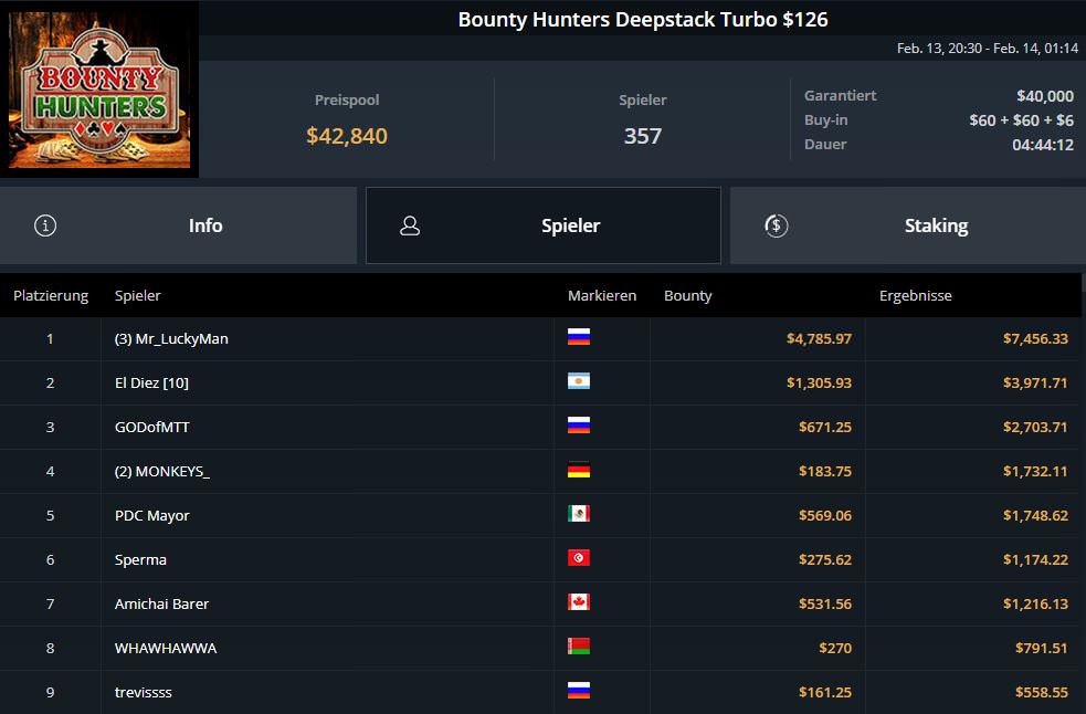 Einen Turniersieg schnappte kevinho87 aus Österreich beim $125 Daily Special. Bei 457 Entries wurden hier $52.555 an Preisgeldern ausgespielt, kevinho bekam davon für den Sieg $9.299,92 ausbezahlt. Platz drei belegte mit taxidriver ebenfalls ein Spieler aus Österreich, für ihn gab es $5.2259,49 Preisgeld.