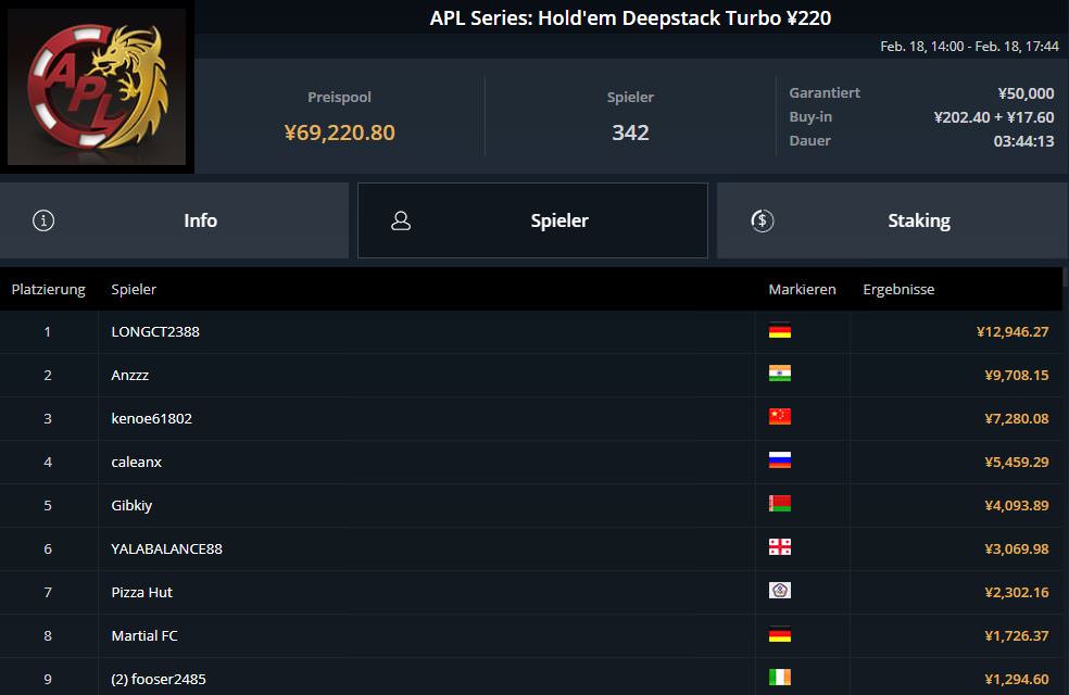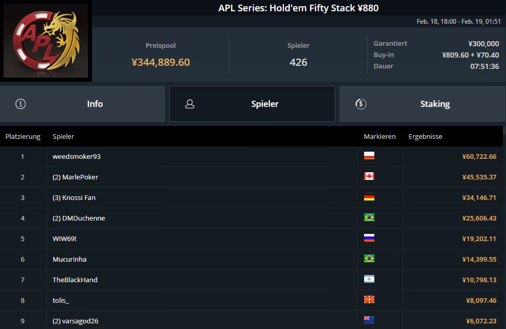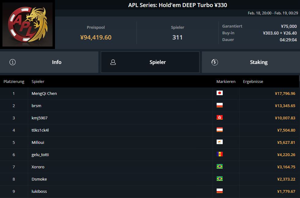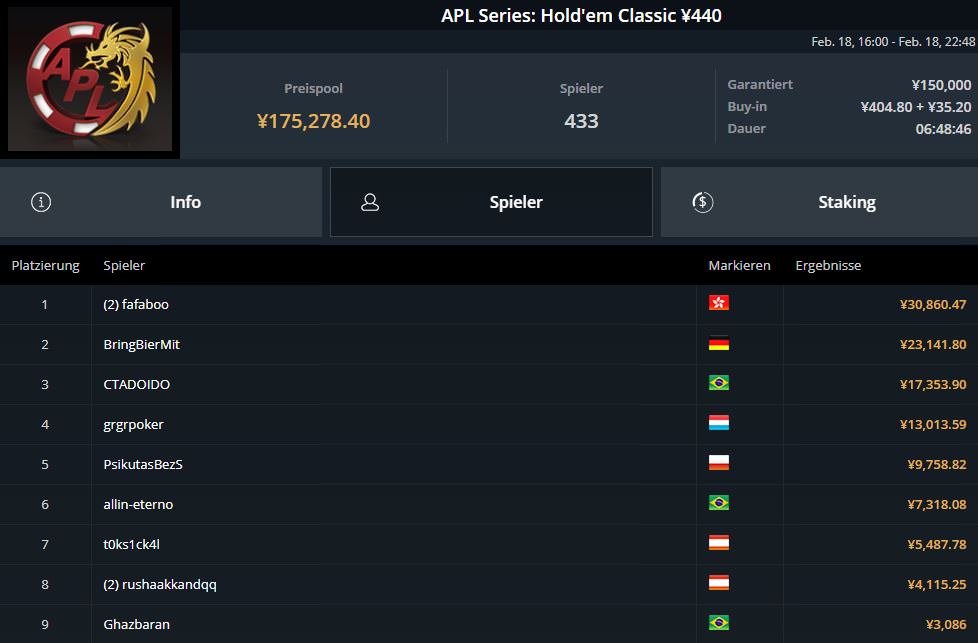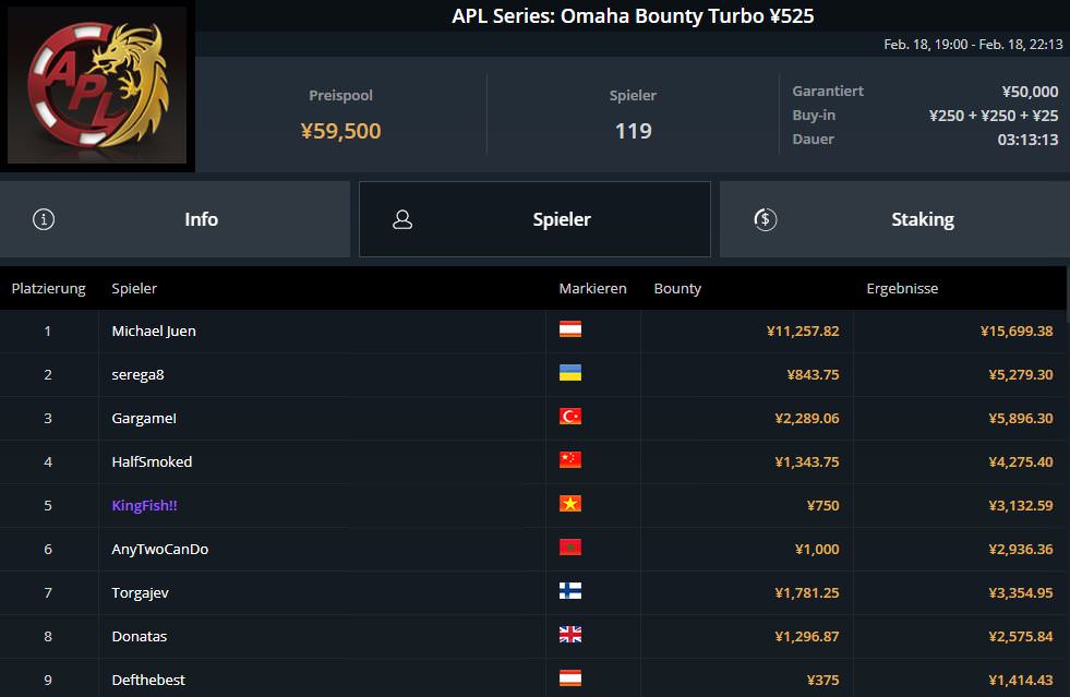 LONGCT2388 gewann ein ¥220 Hold’em Deepstack Turbo und umgerechnet rund €1.658 Prämie, Michael Juen ein ¥525 Omaha Bounty Turbo für €2.011. BringBierMit belegte bei ¥440 Hold’em Classic Platz zwei für rund €2.964 und Knossi Fan kassierte als Dritter beim ¥880 Fifty Stack sogar umgerechnet €4.374 Preisgeld.