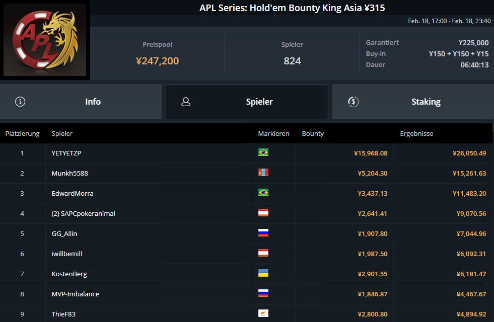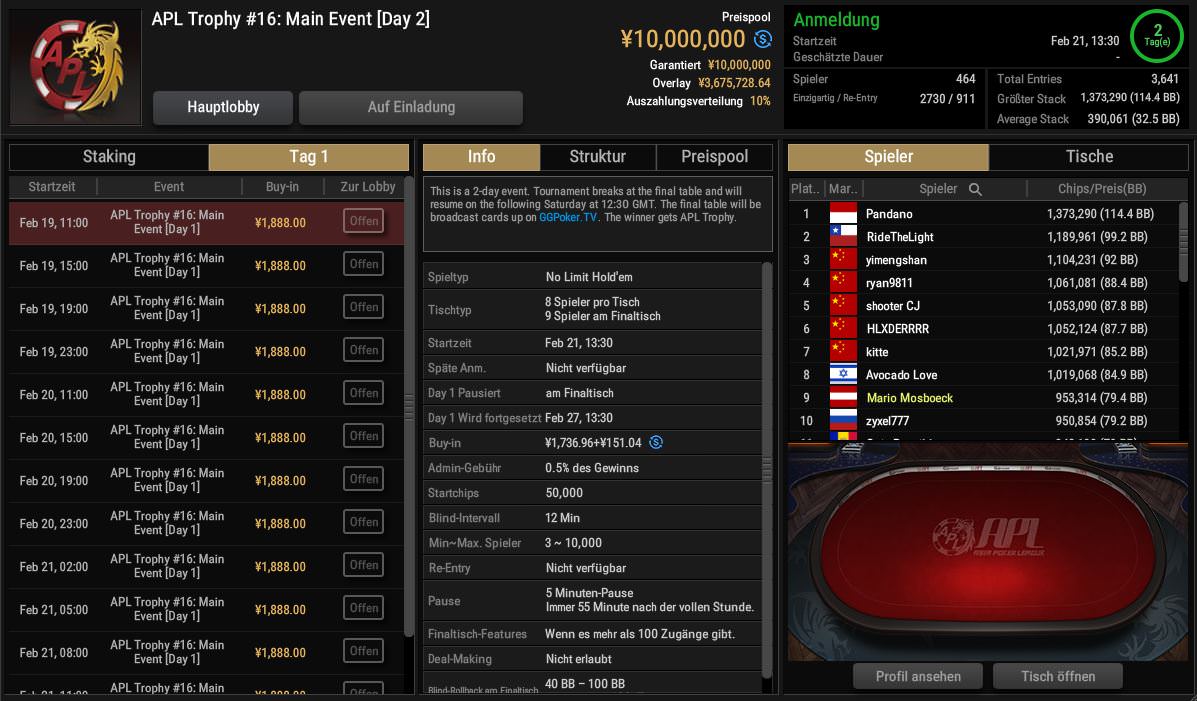 Auch beim ¥1.888 APL Trophy Main Event wurde gestern wieder Tag eins gespielt und bei noch über zehn ausstehenden Starttagen sieht es danach aus, dass die garantierten ¥10 Millionen (ca. €1,28 Millionen) erreicht werden. Aktuell fehlen noch gut ¥3,6 Millionen, Spieltag 2 wird am kommenden Sonntag (21. Februar) um 13:30 Uhr gespielt.