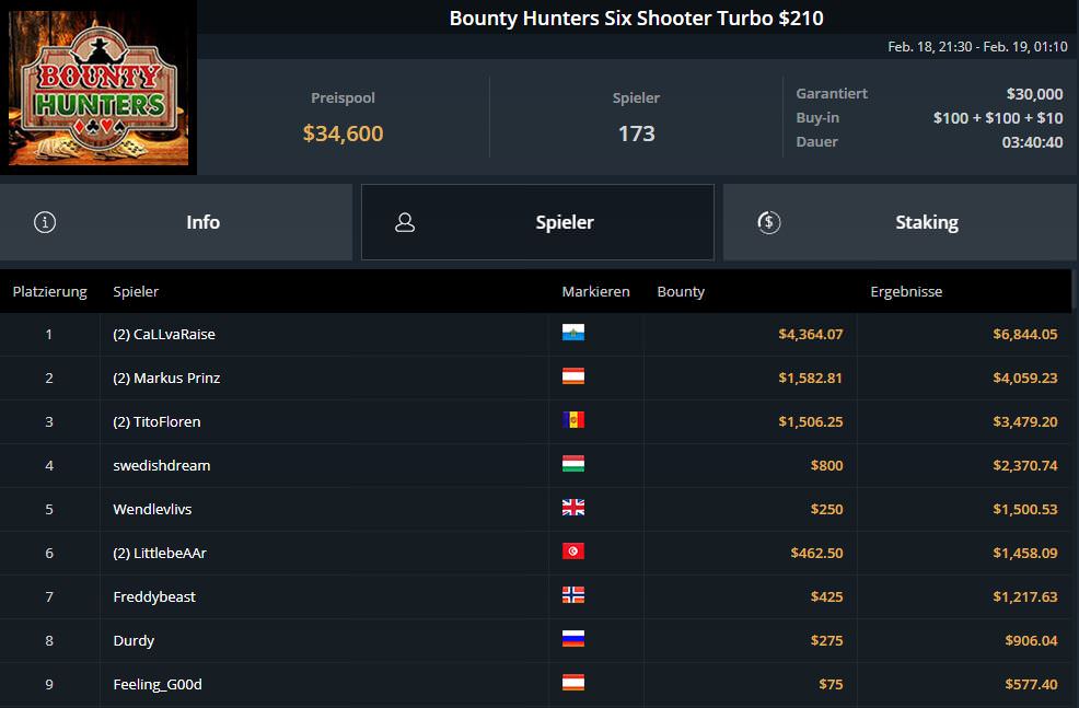 Knapp an einem Sieg ist Markus Prinz beim $210 Bounty Hunters Six Shooter Turbo vorbeigeschrammt. Als Runner-up musste er sich mit $4.059,23 zufrieden geben.