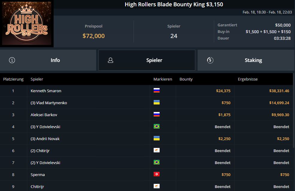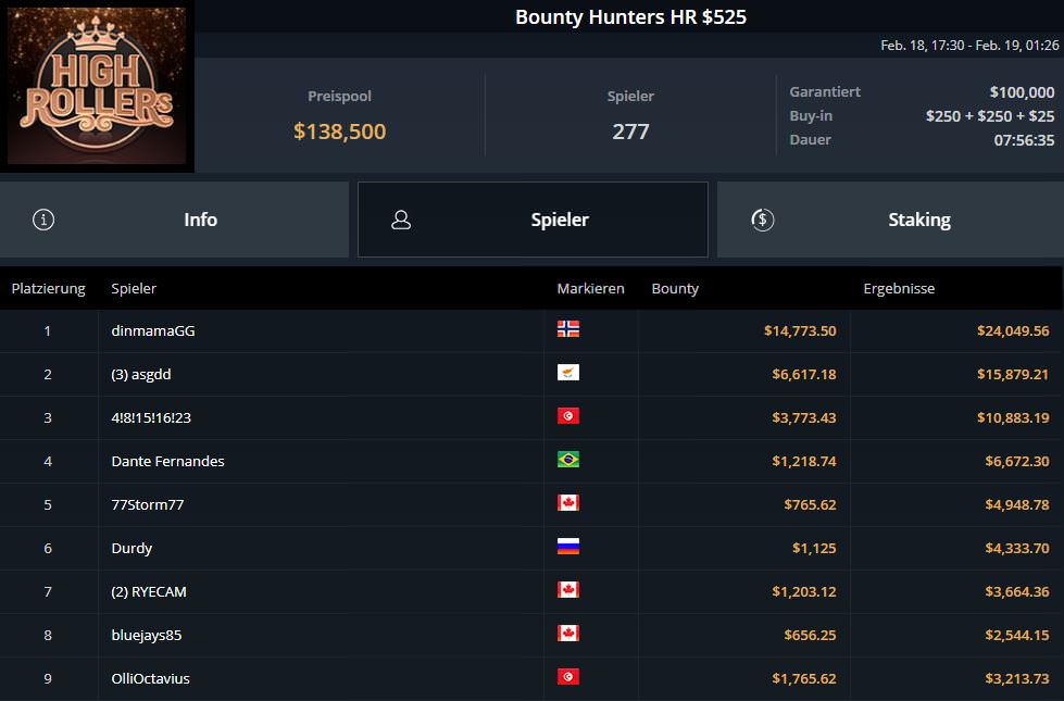 Den höchsten Einzel-Cash bei den Dailys holte aus deutschsprachiger Sicht Markus Durnegger, der das $315 Bounty King als Dritter abschloss und dafür $9.354,09 ausbezahlt bekam.