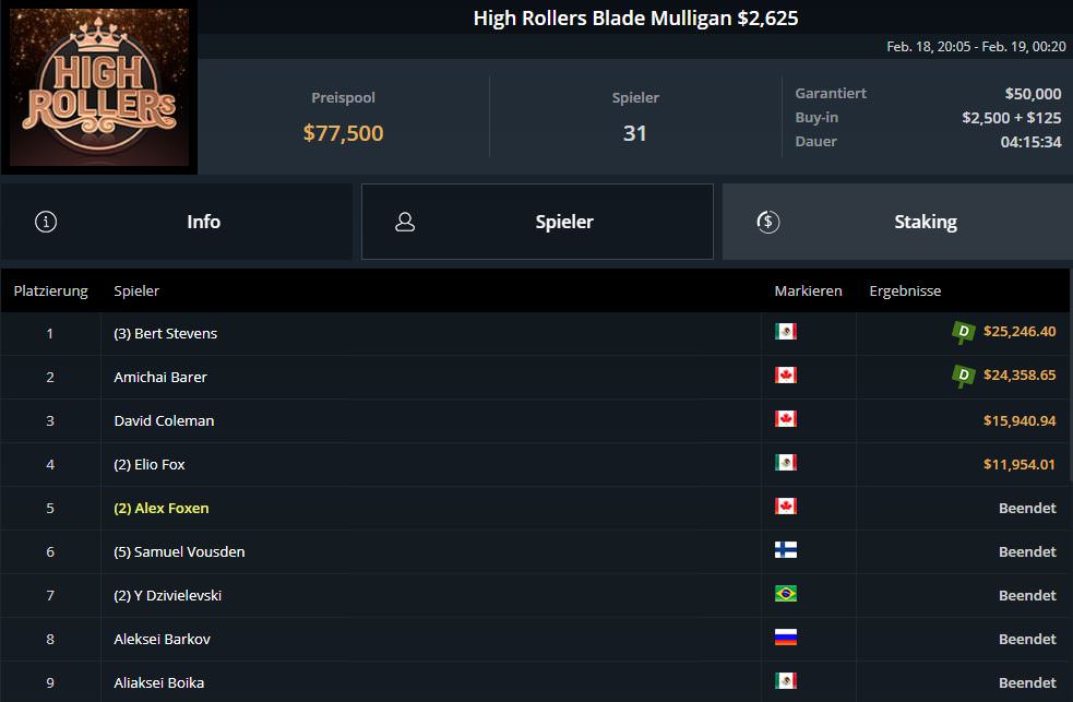 Man14c benötigte dafür zwei Top-Platzierungen. Als Vierter beim $200 Daily Main Event gab es $5.645,60 und als Dritter beim $525 High Rollers Supersonic, das von Alex Foxen ($8.066,72) gewonnen wurde, noch einmal $4.368,25.