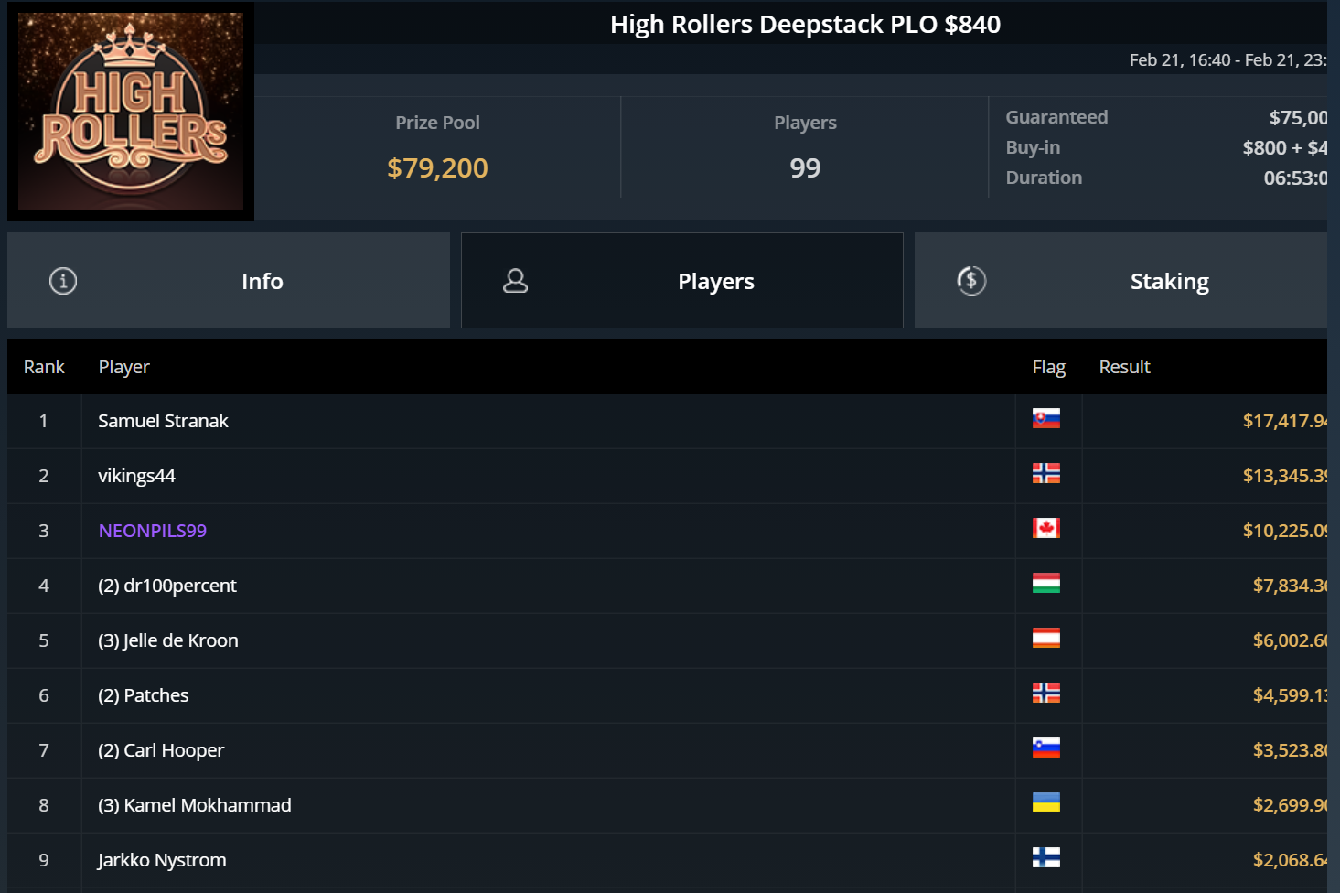 Weitere gute Ergebnisse aus DACH-Sicht erzielten Roland Rokita (Platz 2 beim HR Sunday Cooldown), Stefan Jedlicka (Platz 2 beim HR Supersonic Bounty), Fedor Holz (jeweils Platz 8 beim Sunday 500 und beim Sunday HR Deepstack Bounty Turbo) sowie Pascal Hartmann (Platz 3 beim Sunday HR FAST)