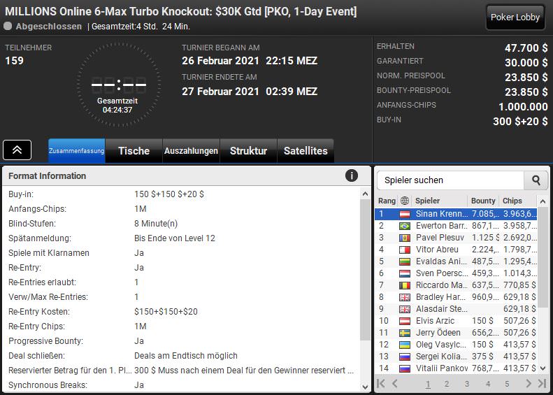 Einen Sieg für einen Spieler aus Österreich brachte das $320 NLHE 6-Max Turbo Knockout. Bei 159 Entries lagen $47.700 im Preispool und hier setzte sich Sinan Krennmair gegen die Konkurrenz durch, sodass er neben $3.963,68 Prämie auch $7.085,16 an Bounties einsammelte.