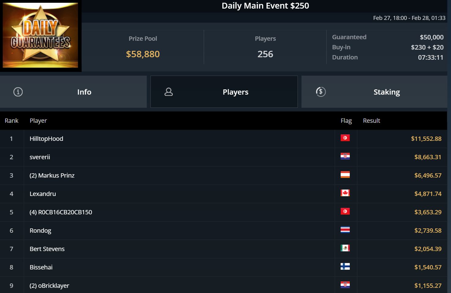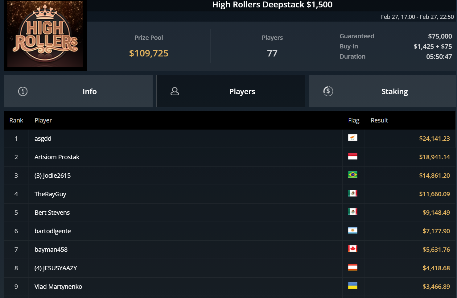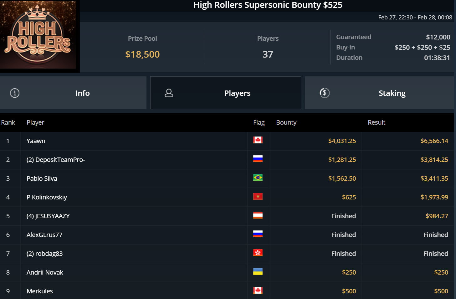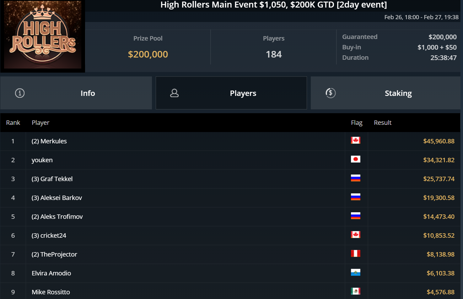 Größter Gewinner am Samstag war der Kanadier „Merkules“, der für seinen Sieg im Finale des High Roller Main Event rund $46.000 kassierte.