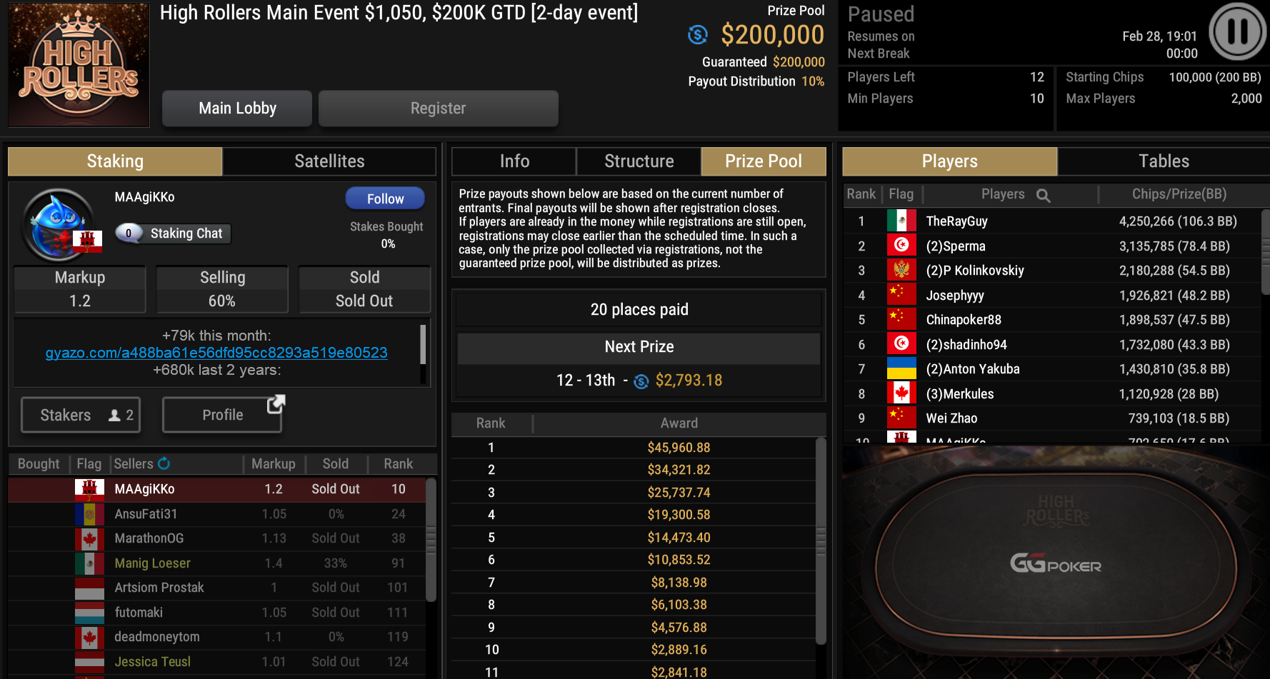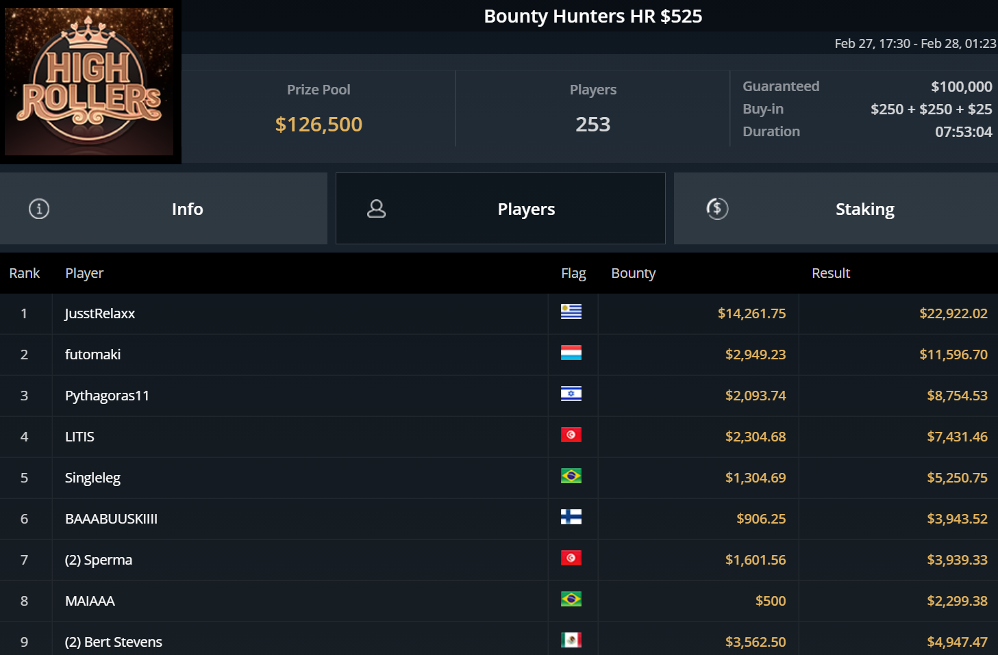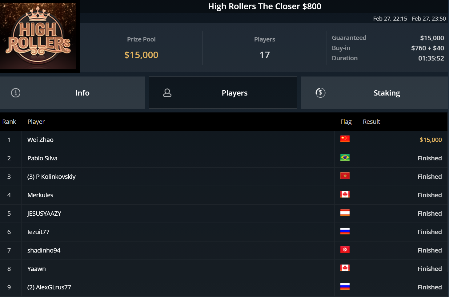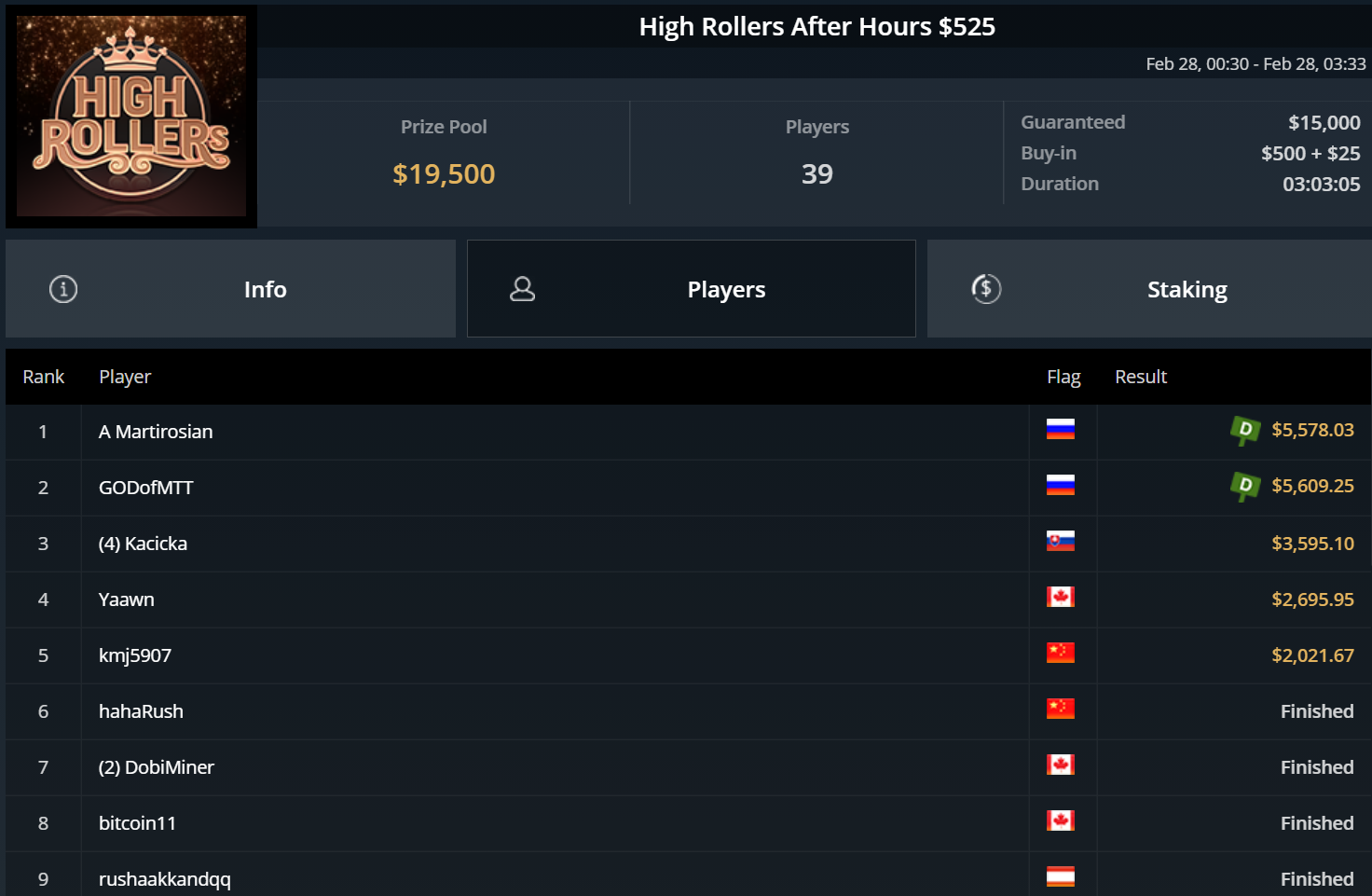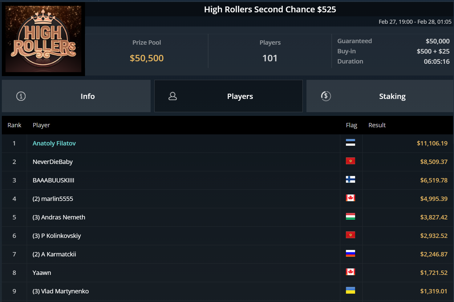 Größter Gewinner am Samstag war der Kanadier „Merkules“, der für seinen Sieg im Finale des High Roller Main Event rund $46.000 kassierte.