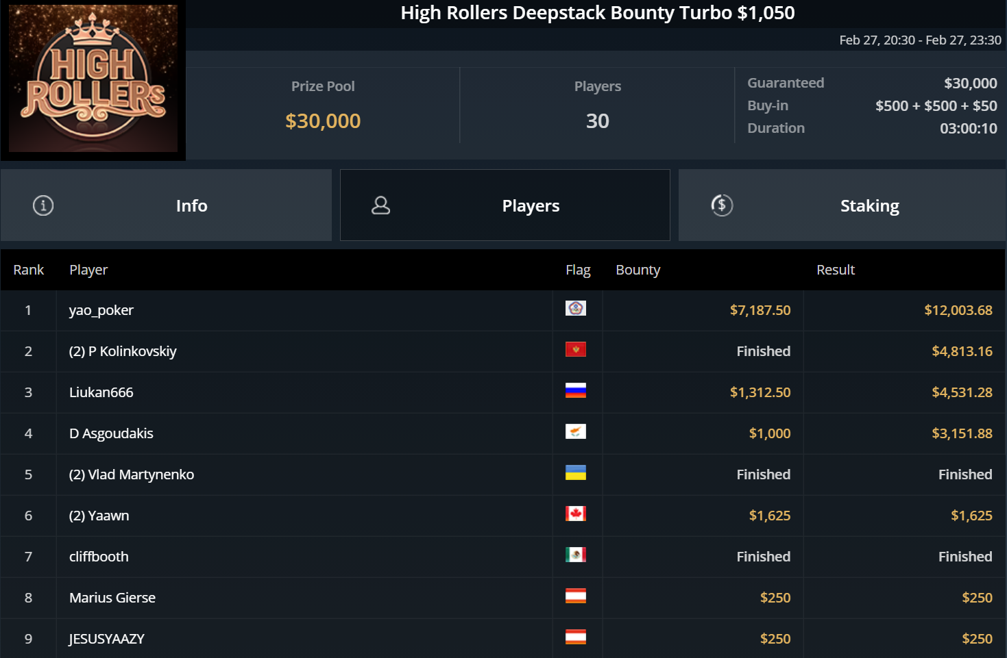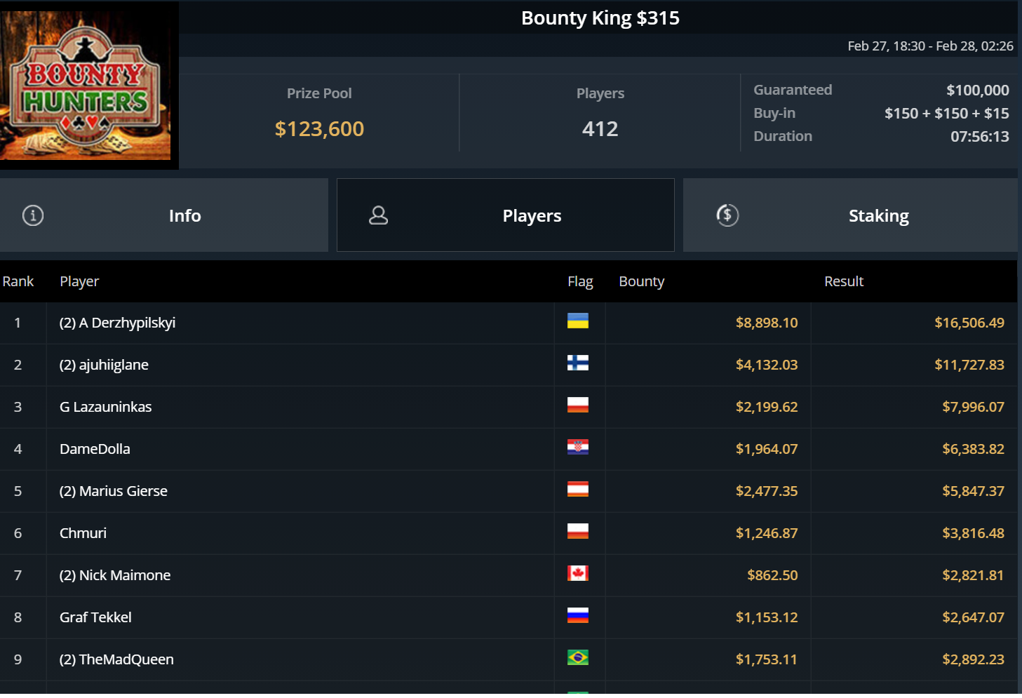 Außerdem cashte er noch als Fünfter beim „kleinen“, $315 teuren Bounty King und räumte weitere knapp $6.000 Preisgeld ab.
