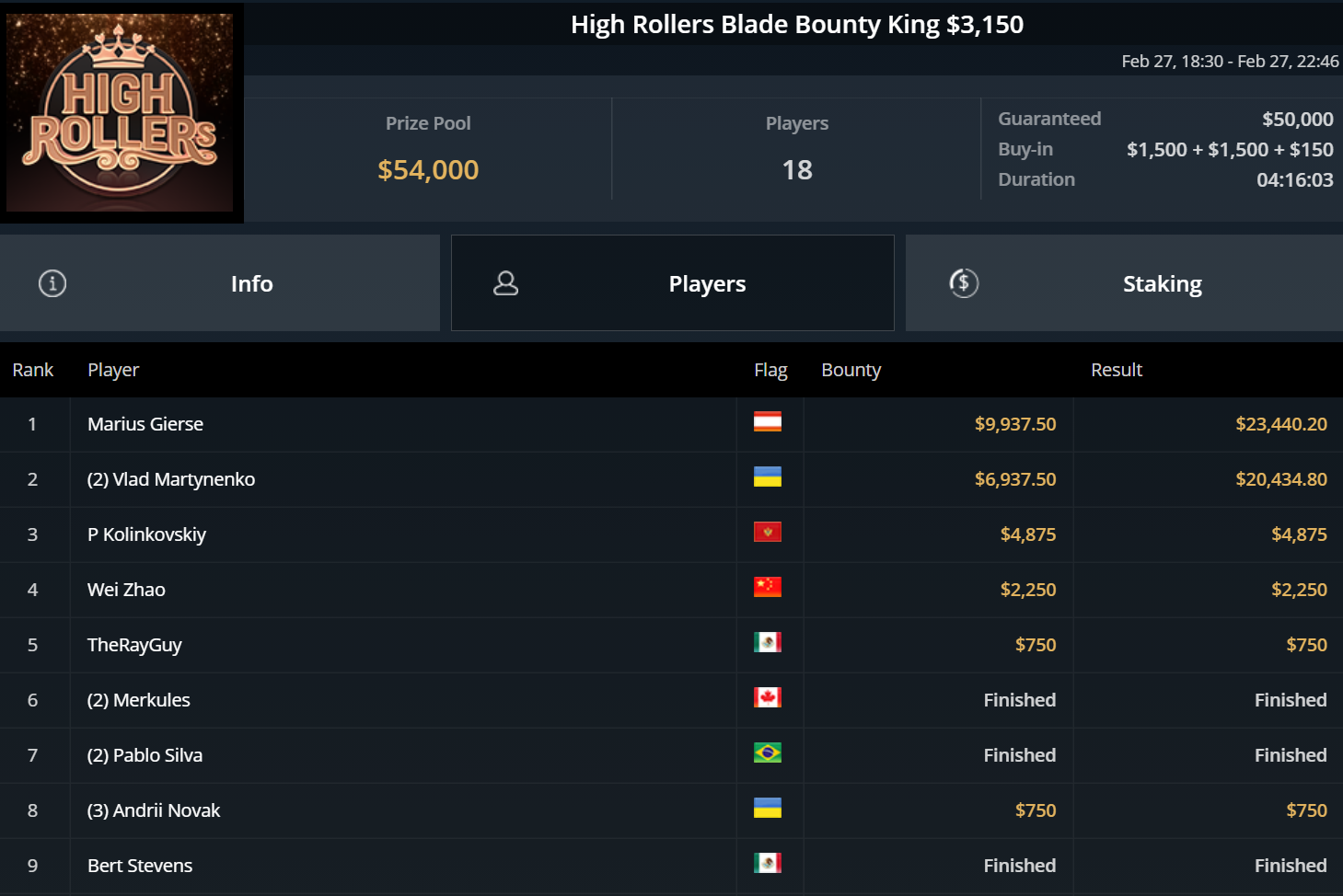 Gierse ließ beim $3.150 HR Blade Bounty King seine 17 Konkurrenten hinter sich und kassierte mit Bountys rund $23.000.