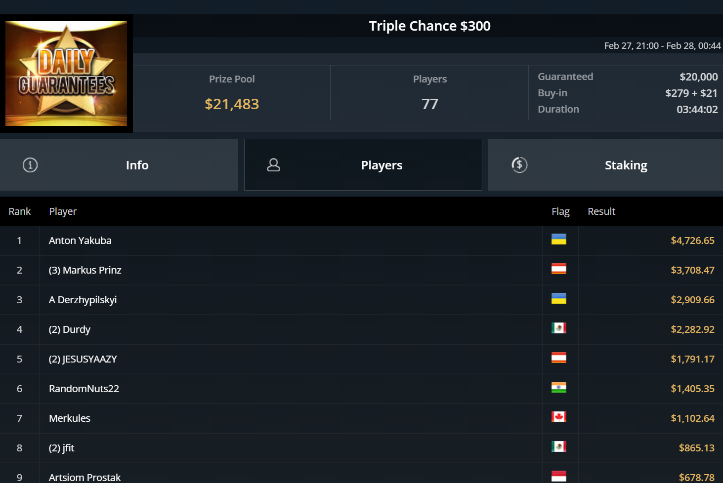 Zwei Top-Ergebnisse erzielte auch Markus Prinz. Der Wahlösterreicher verpasste beim $250 Daily Main Event und beim $300 Triple Chance zwar jeweils knapp den Sieg, landete aber als Zweiter bzw. Dritter auf dem Siegertreppchen.