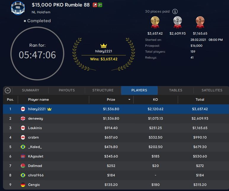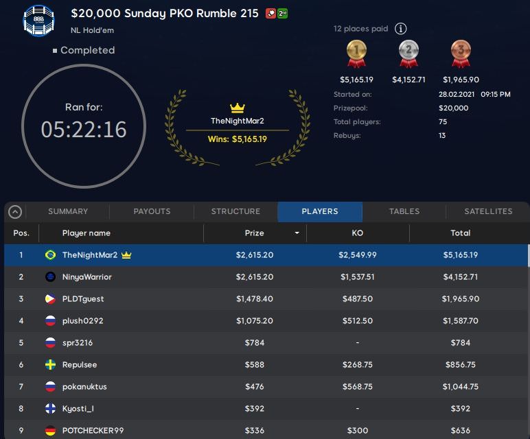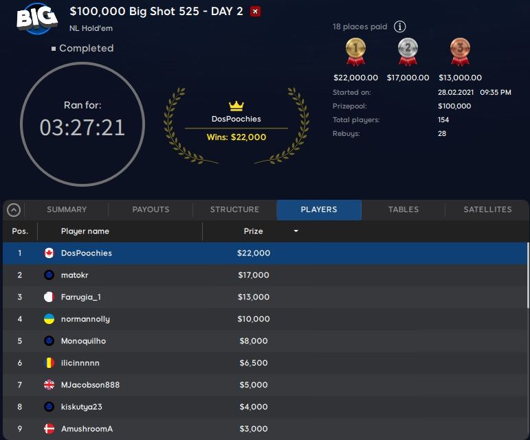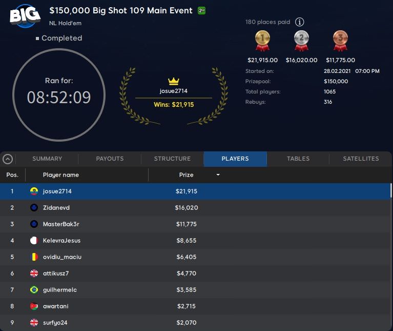 Sogar um $150.000 ging es beim $109 Big Shot, der von „josue2714“ gewonnen wurde. Auch er profitierte von einem Overlay und gewann $21.915.